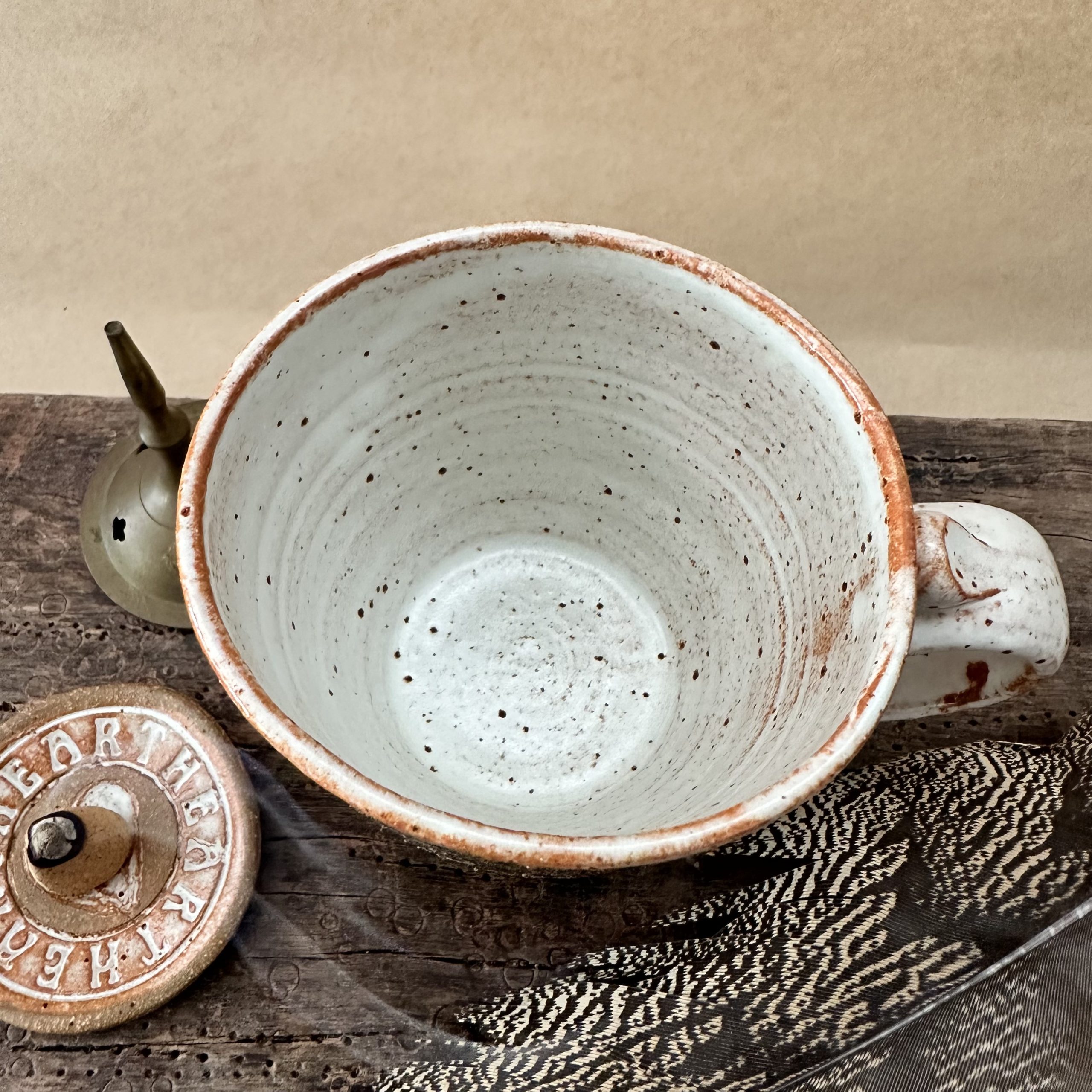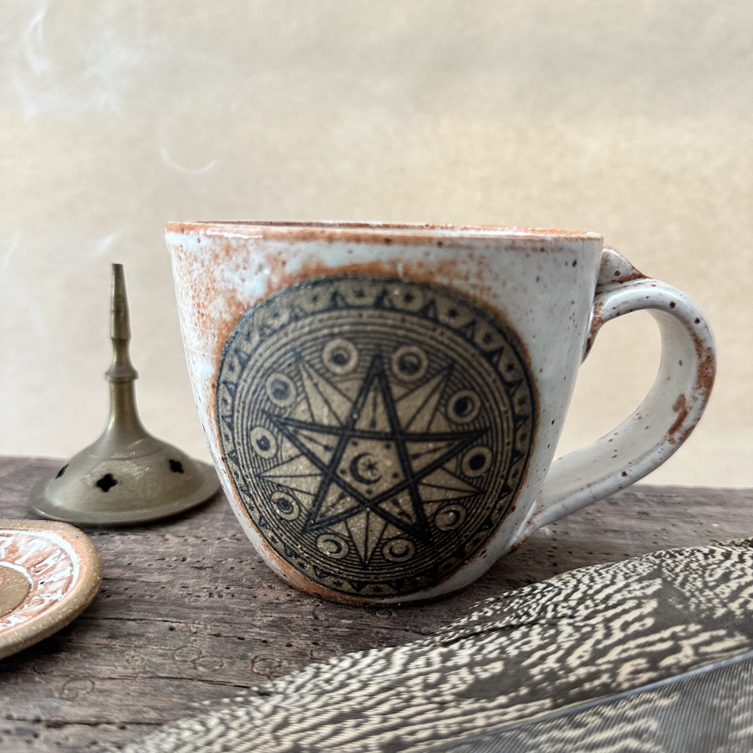 A medium size mug glazed in “Sandstone’ glaze and featuring a Star and Moon decal on the side.