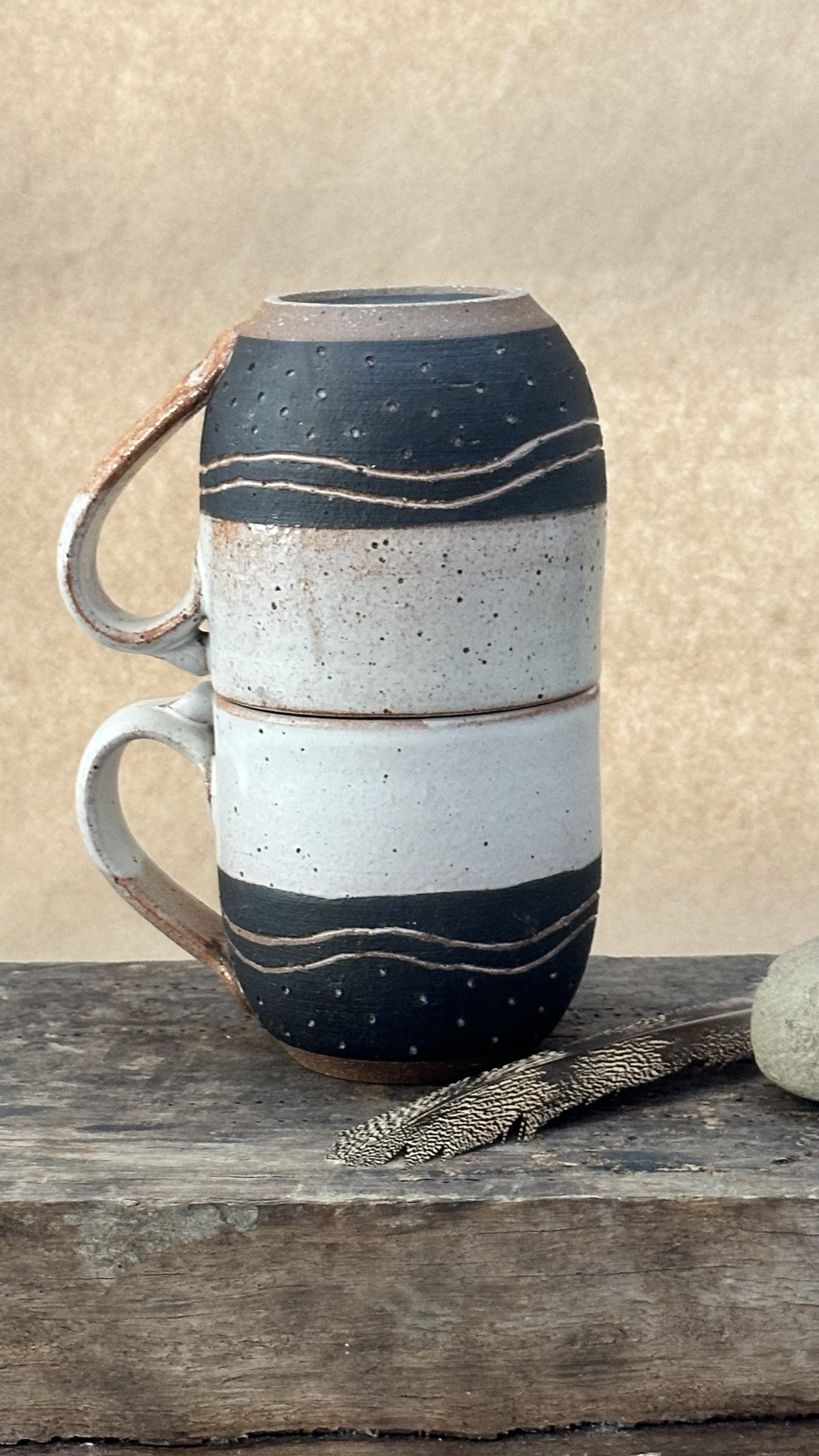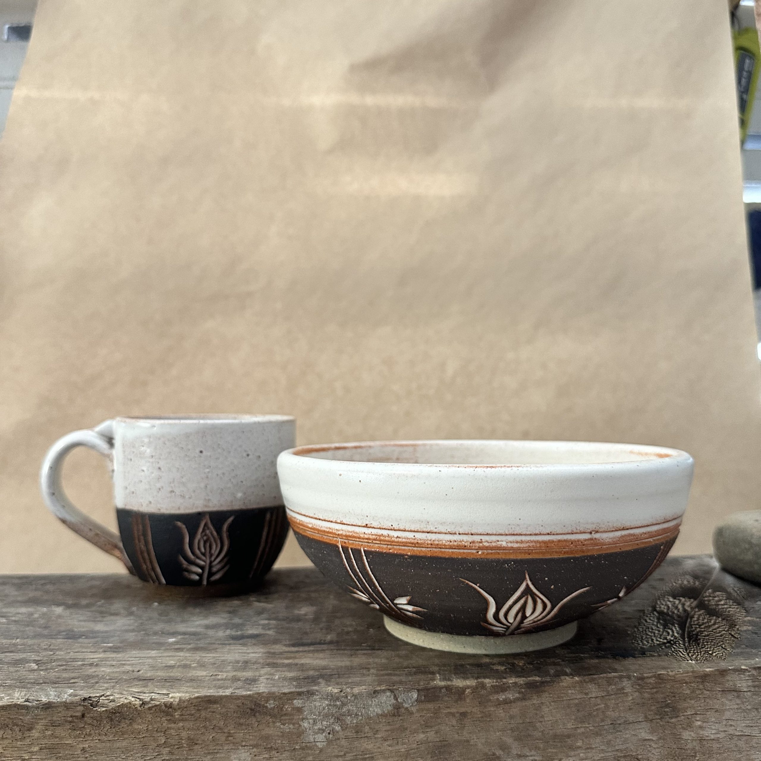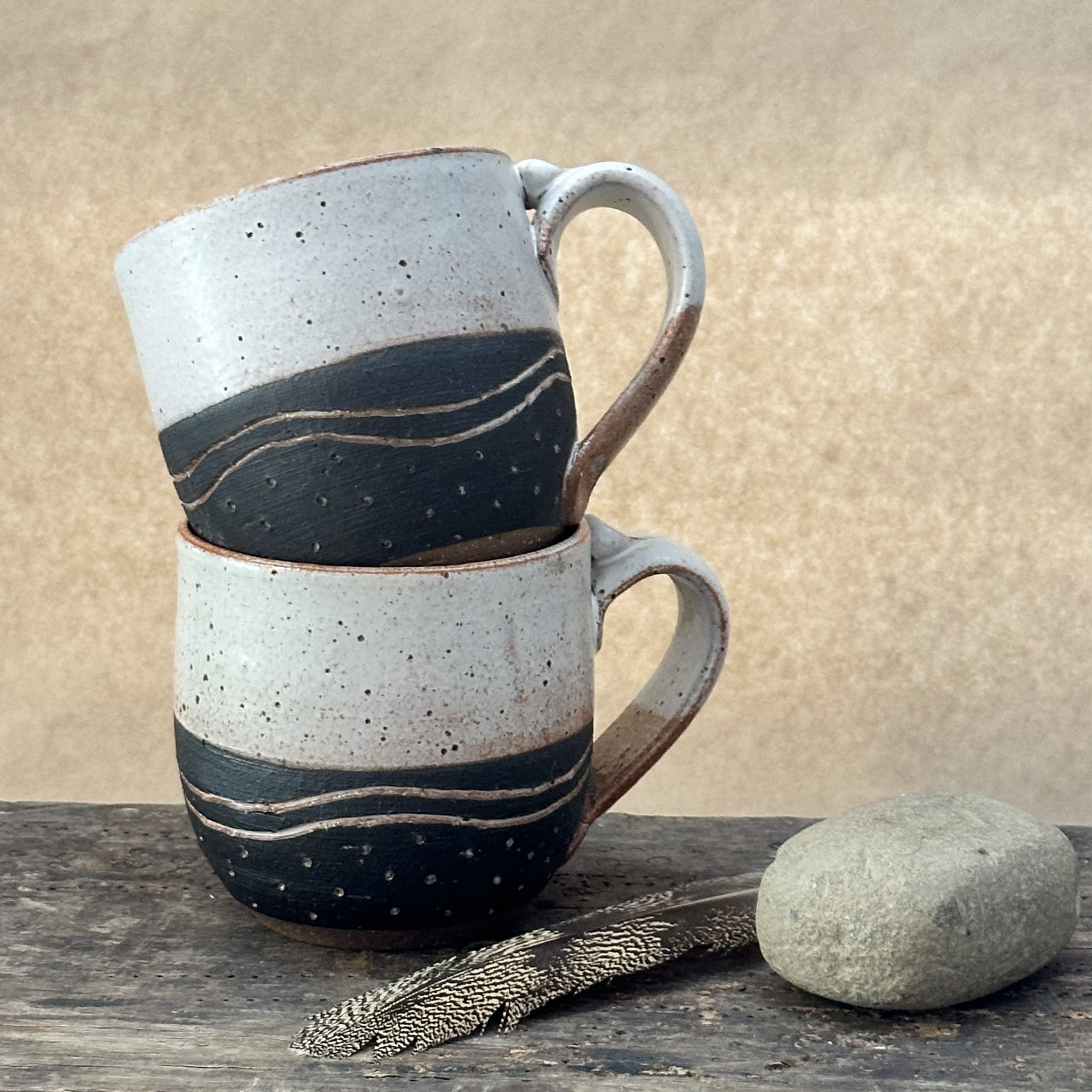 A medium size mug glazed in Sandstone, featuring a dark brown slip bottom of side wall and carving inlaid with white.