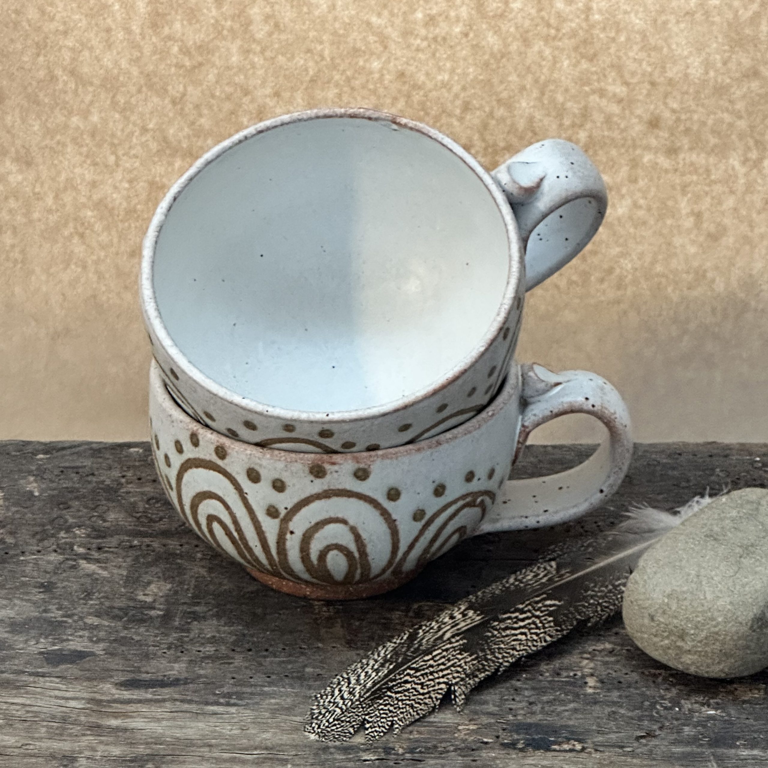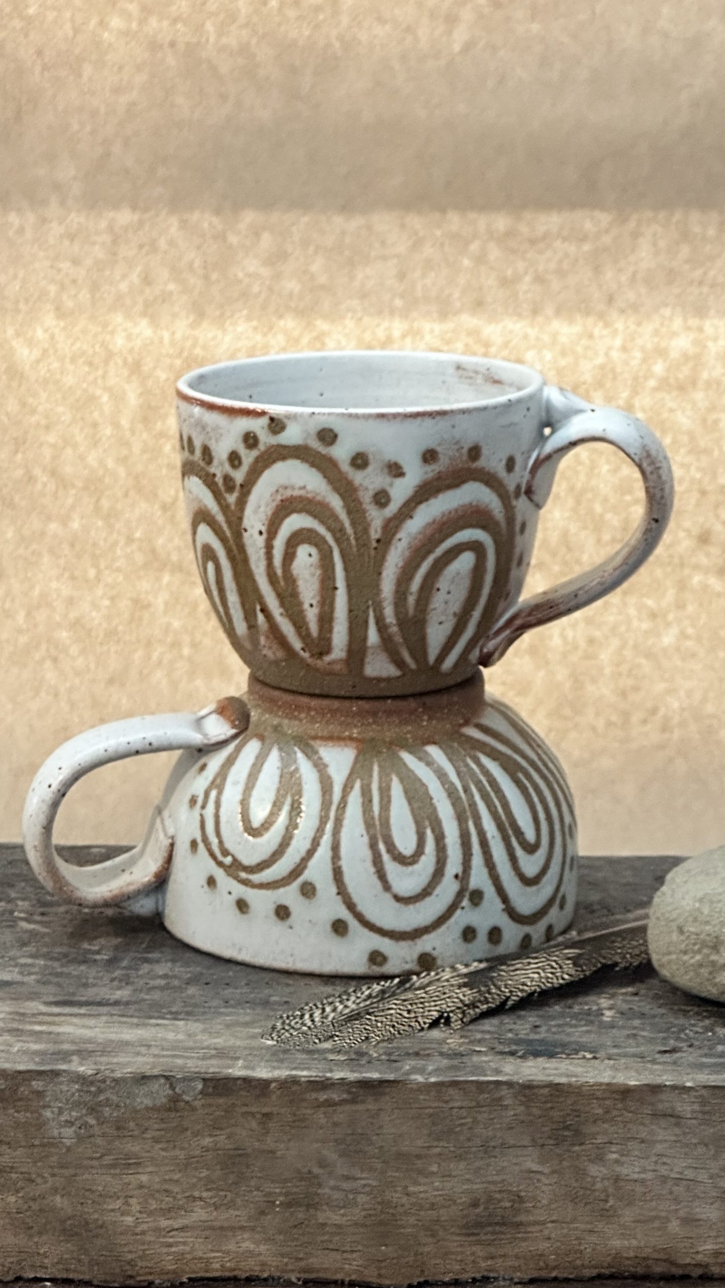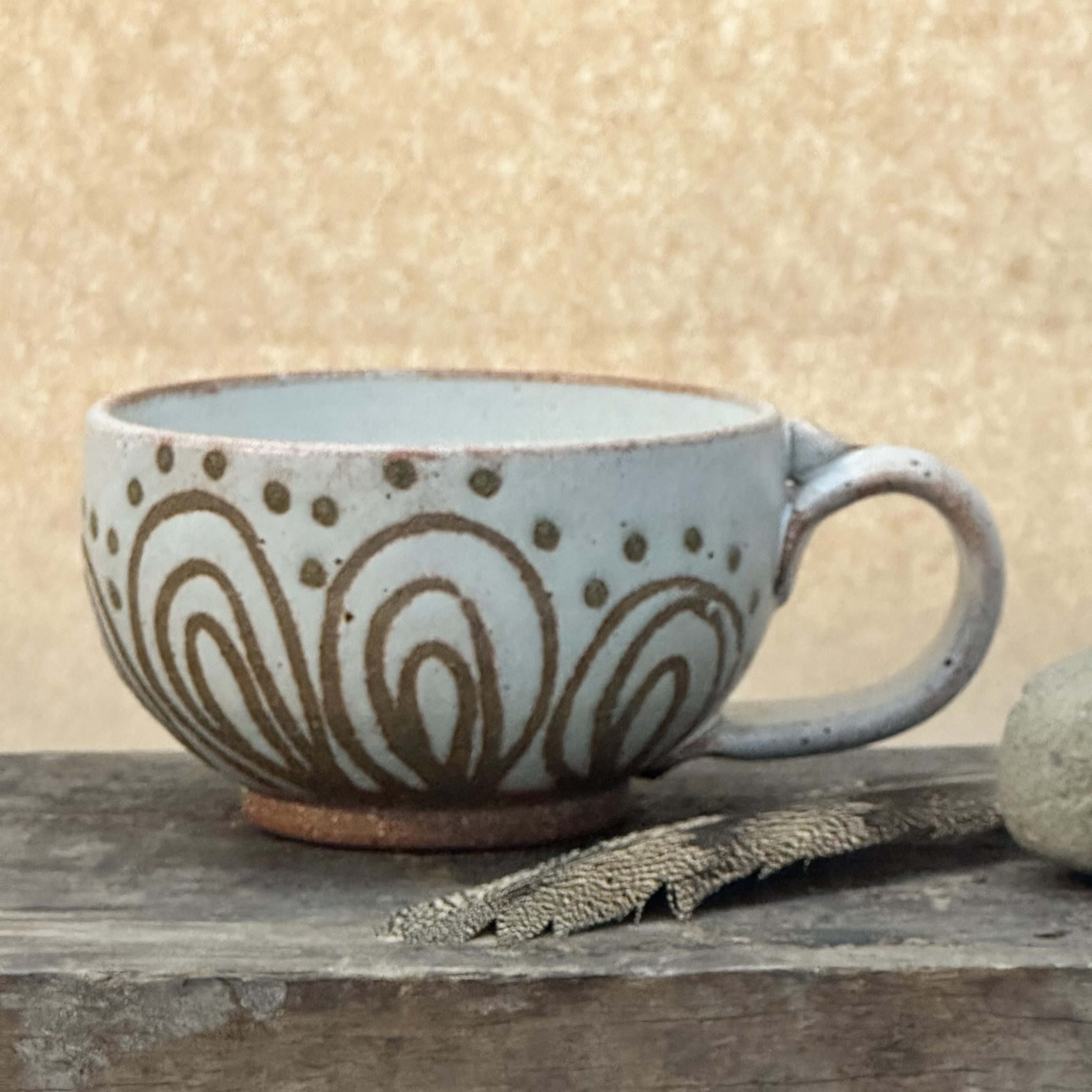 Designed to fit comfortably in your hands. Glazed in the popular Sandstone white glaze detailed with wax resist pattern to feature the clay body.