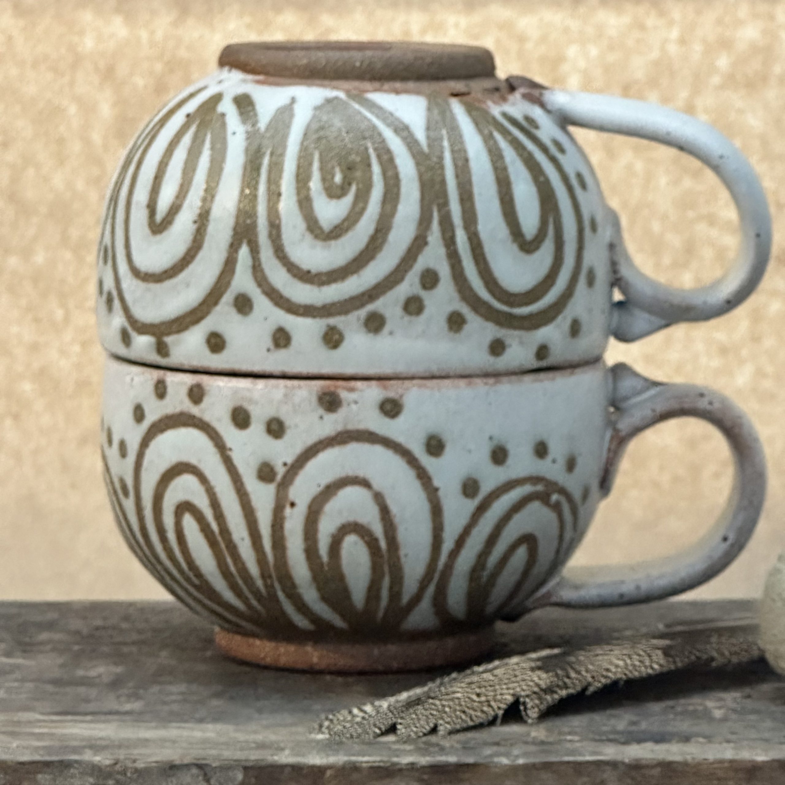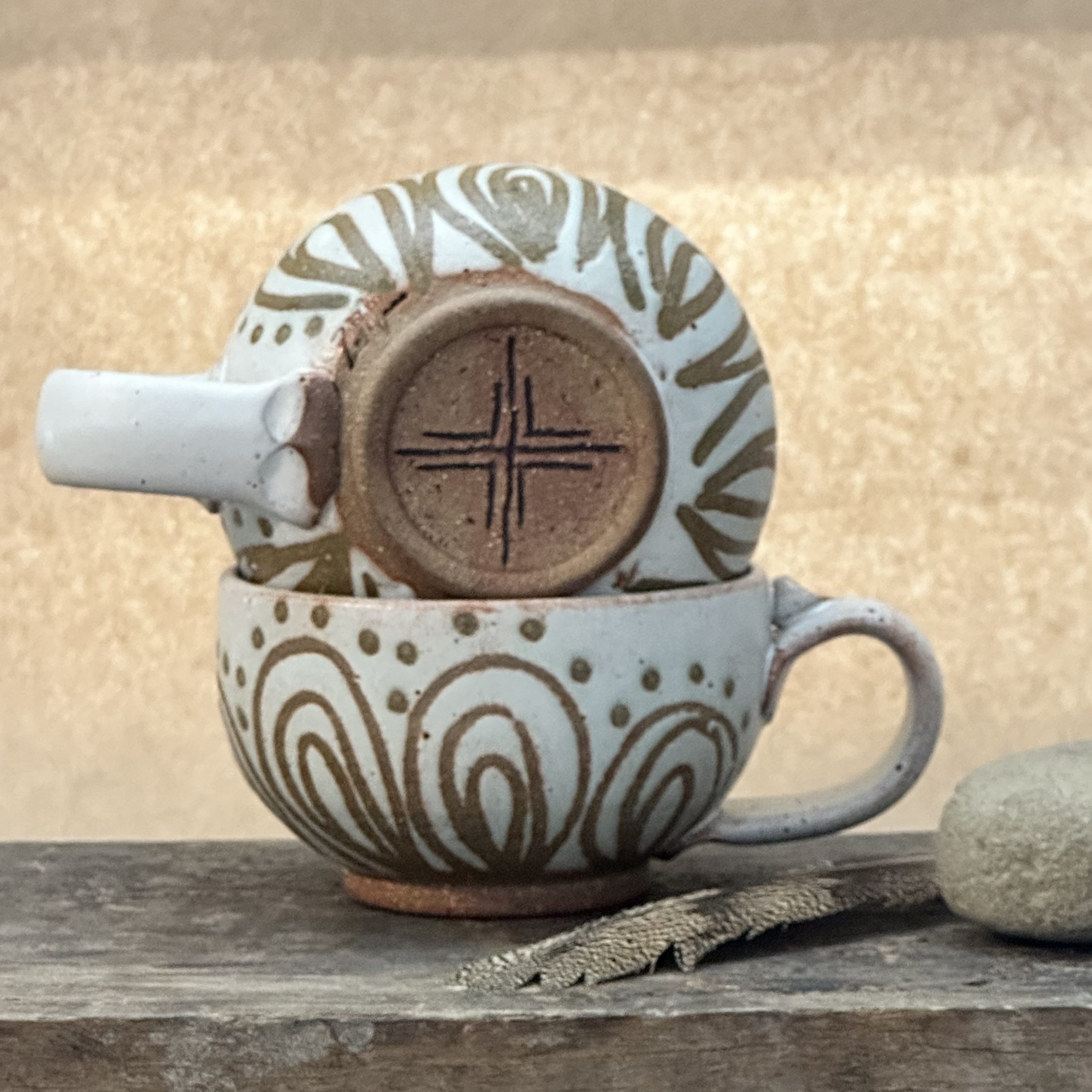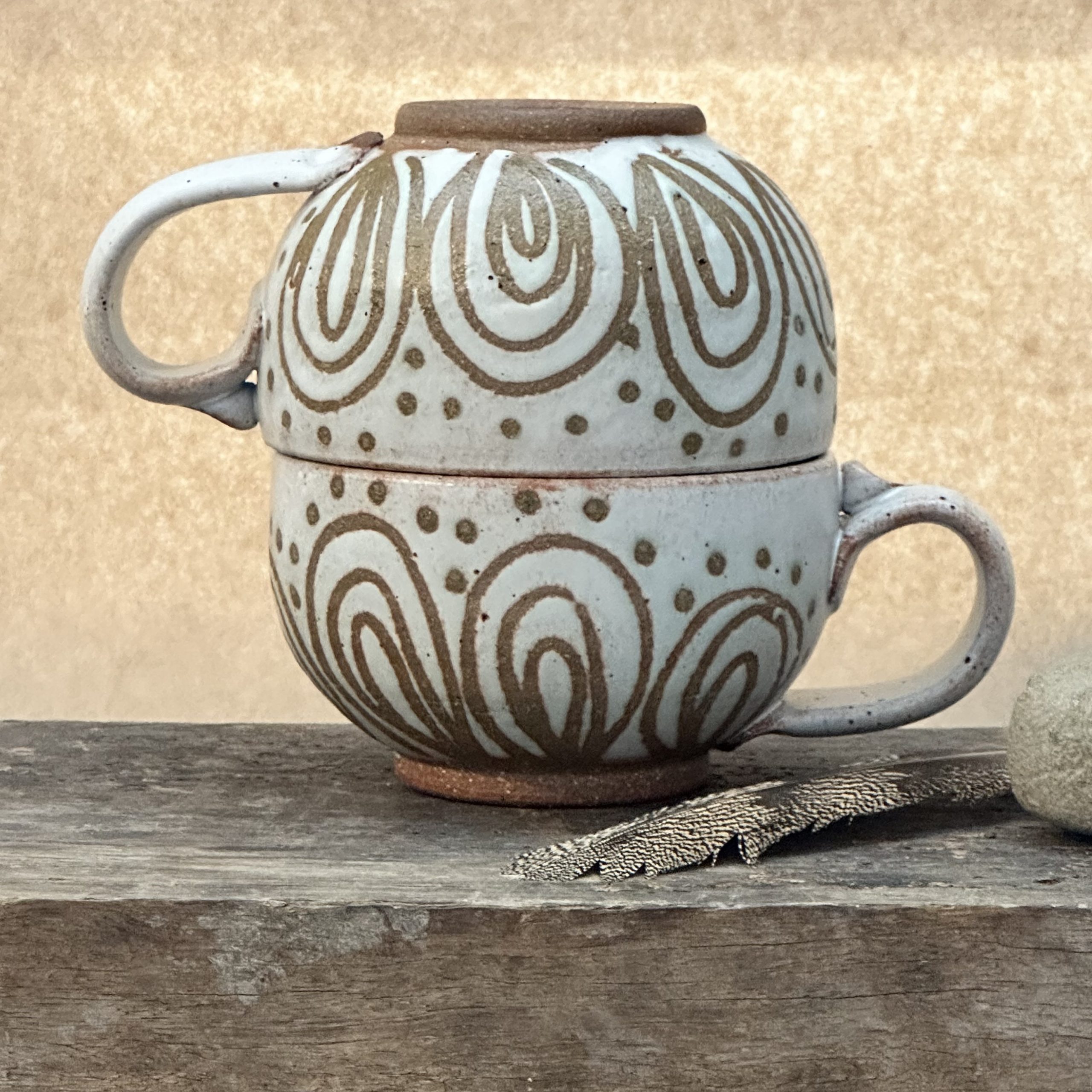 Designed to fit comfortably in your hands. Glazed in the popular Sandstone white glaze detailed with wax resist pattern to feature the clay body.