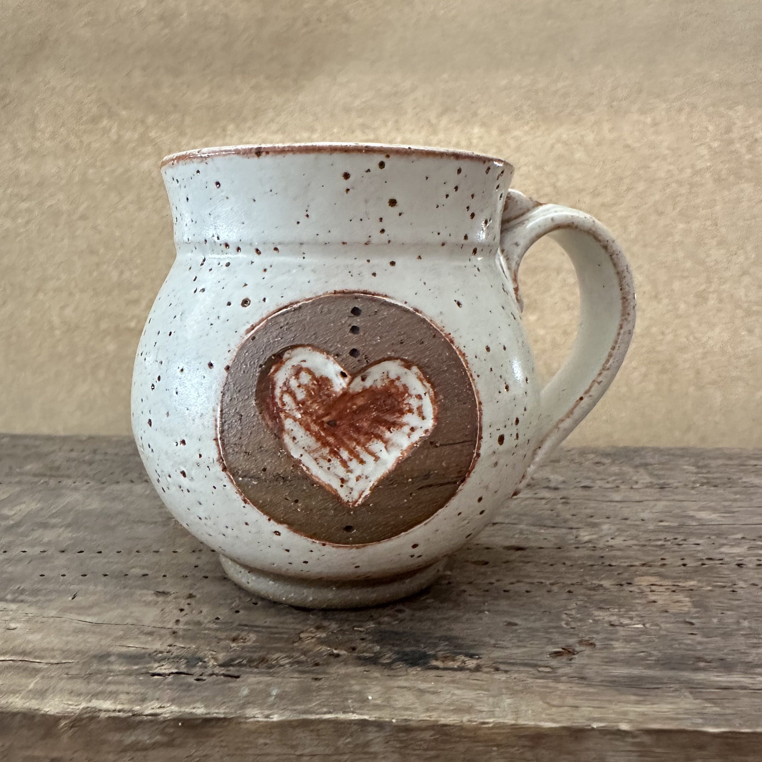 Beautiful curvy Goddess shaped mug glazed in Sandstone white with a carved heart feature.