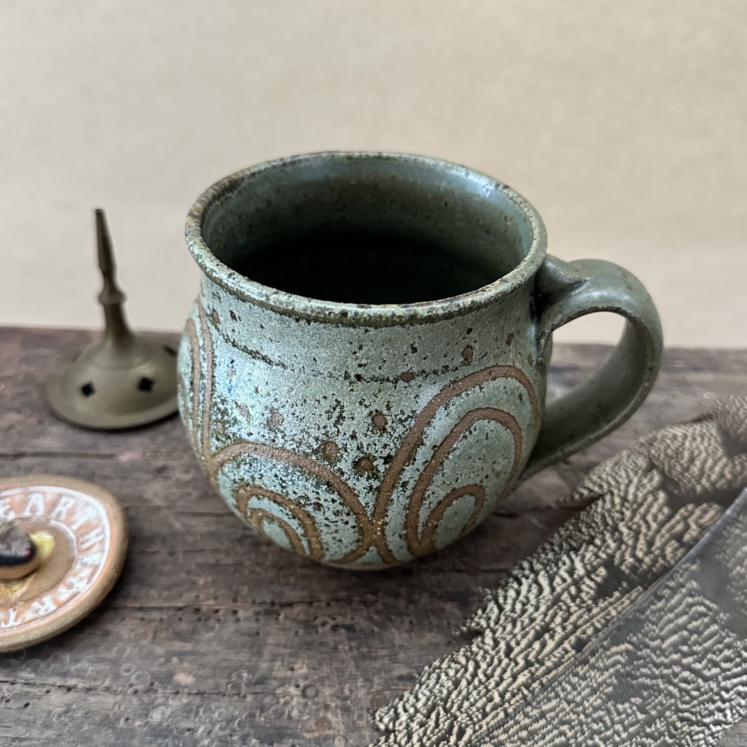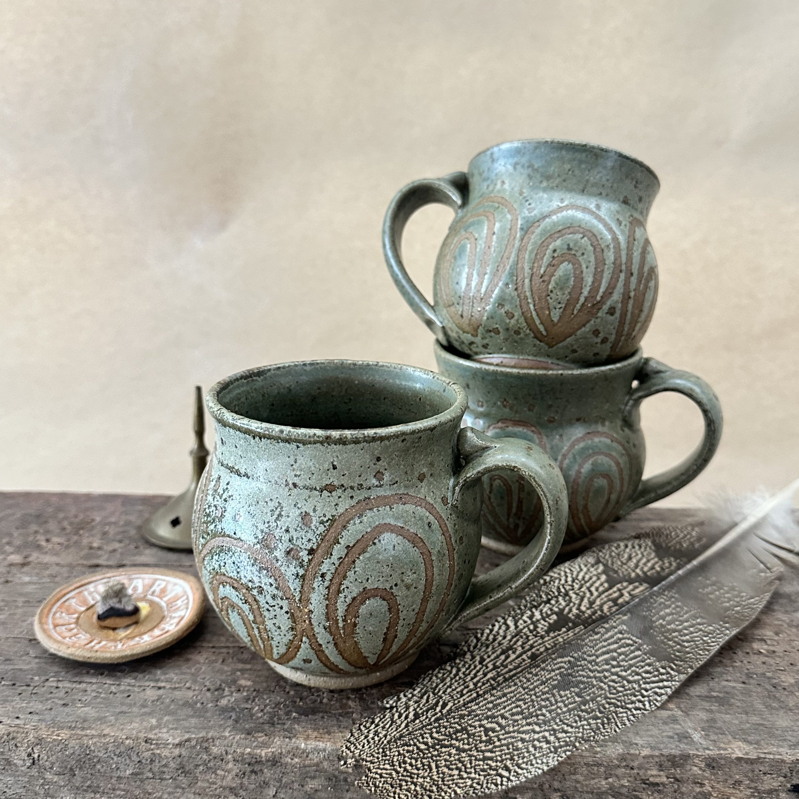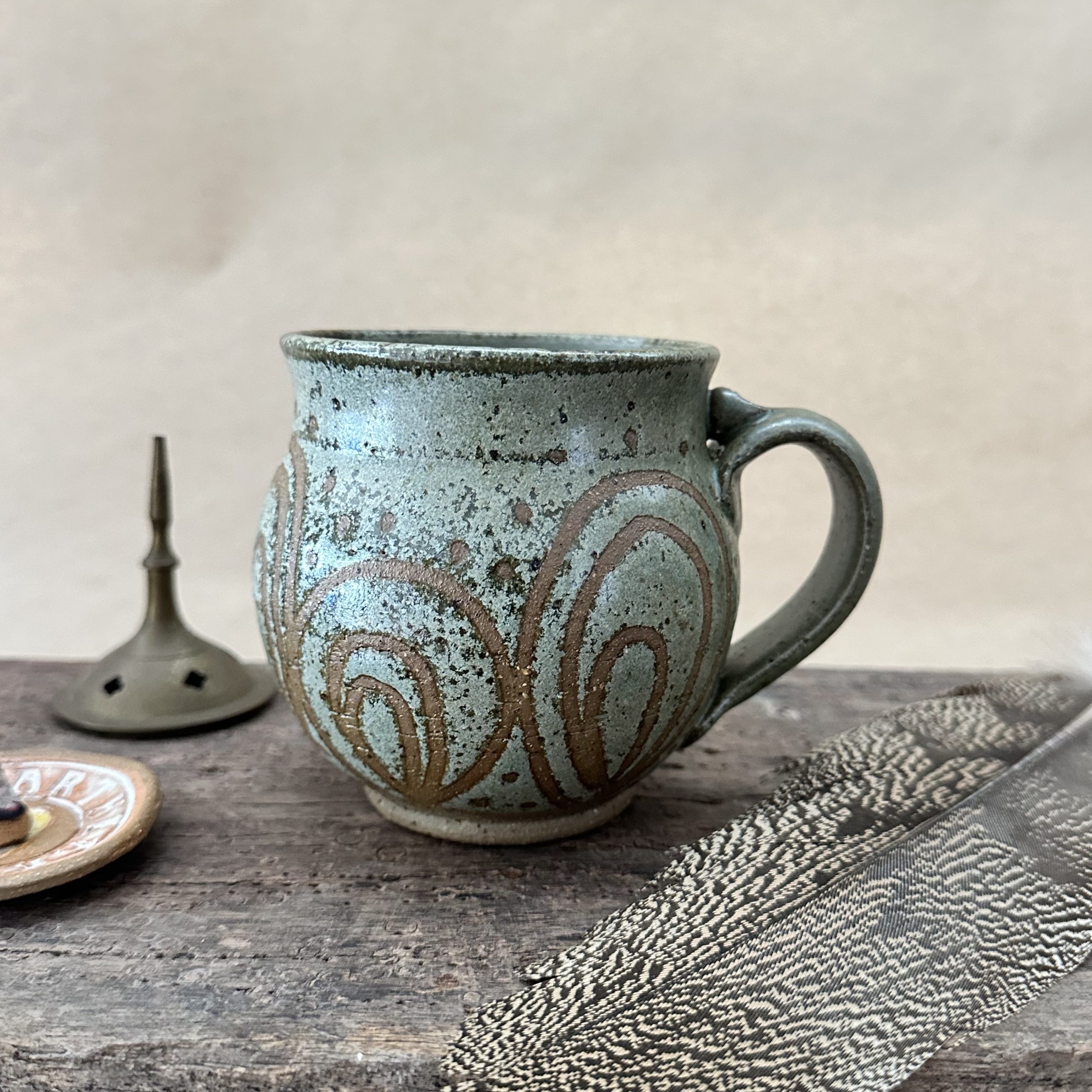 Beautiful curvy Goddess shaped mug glazed in new ‘Lichen’ glaze with peacock design.