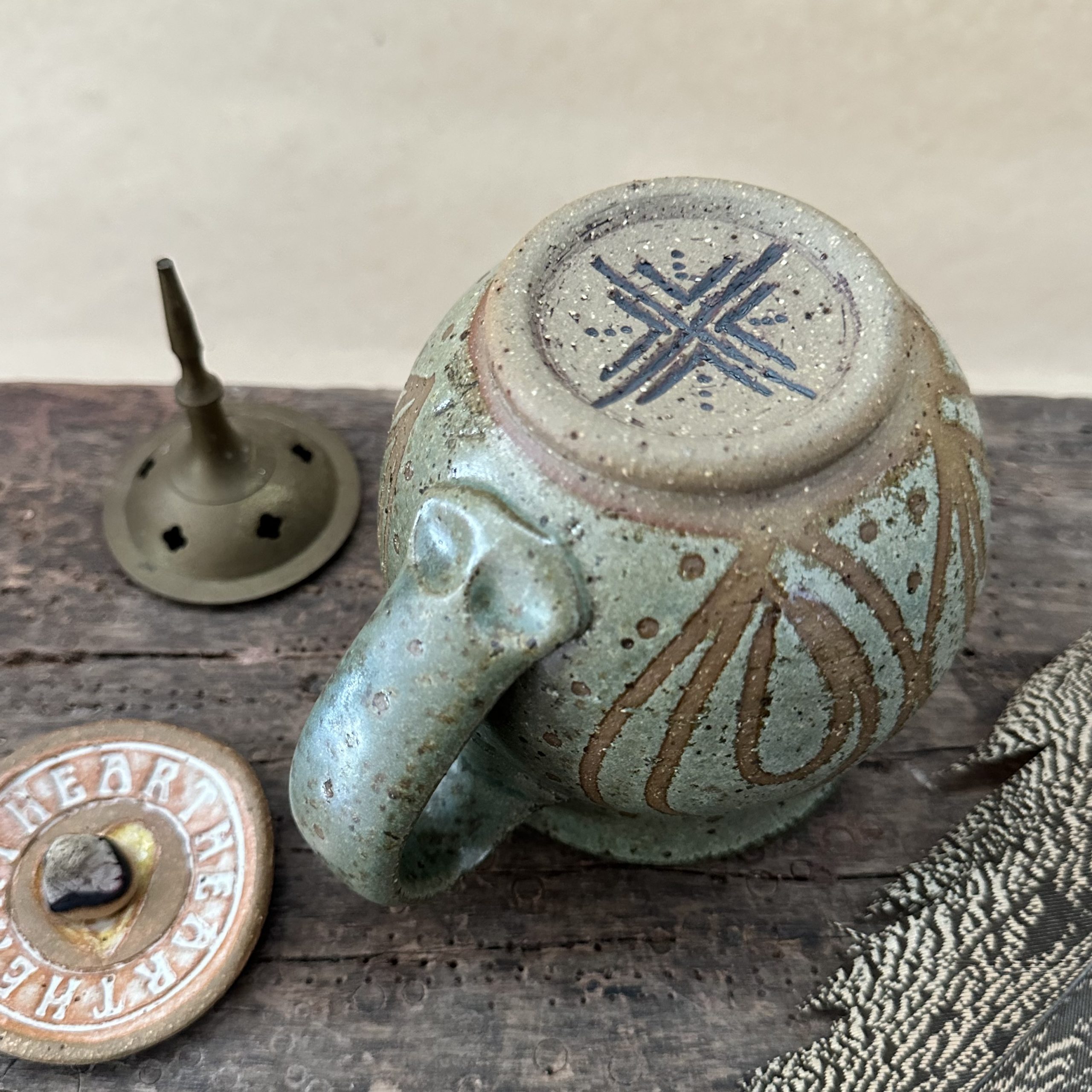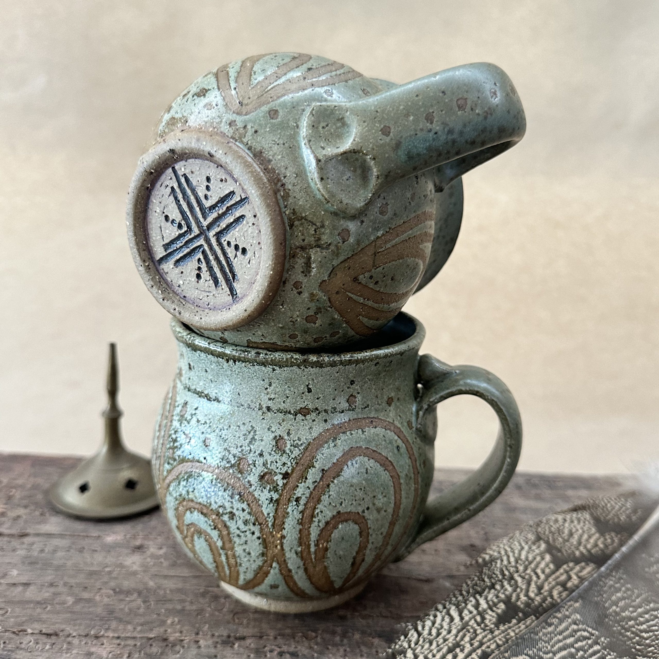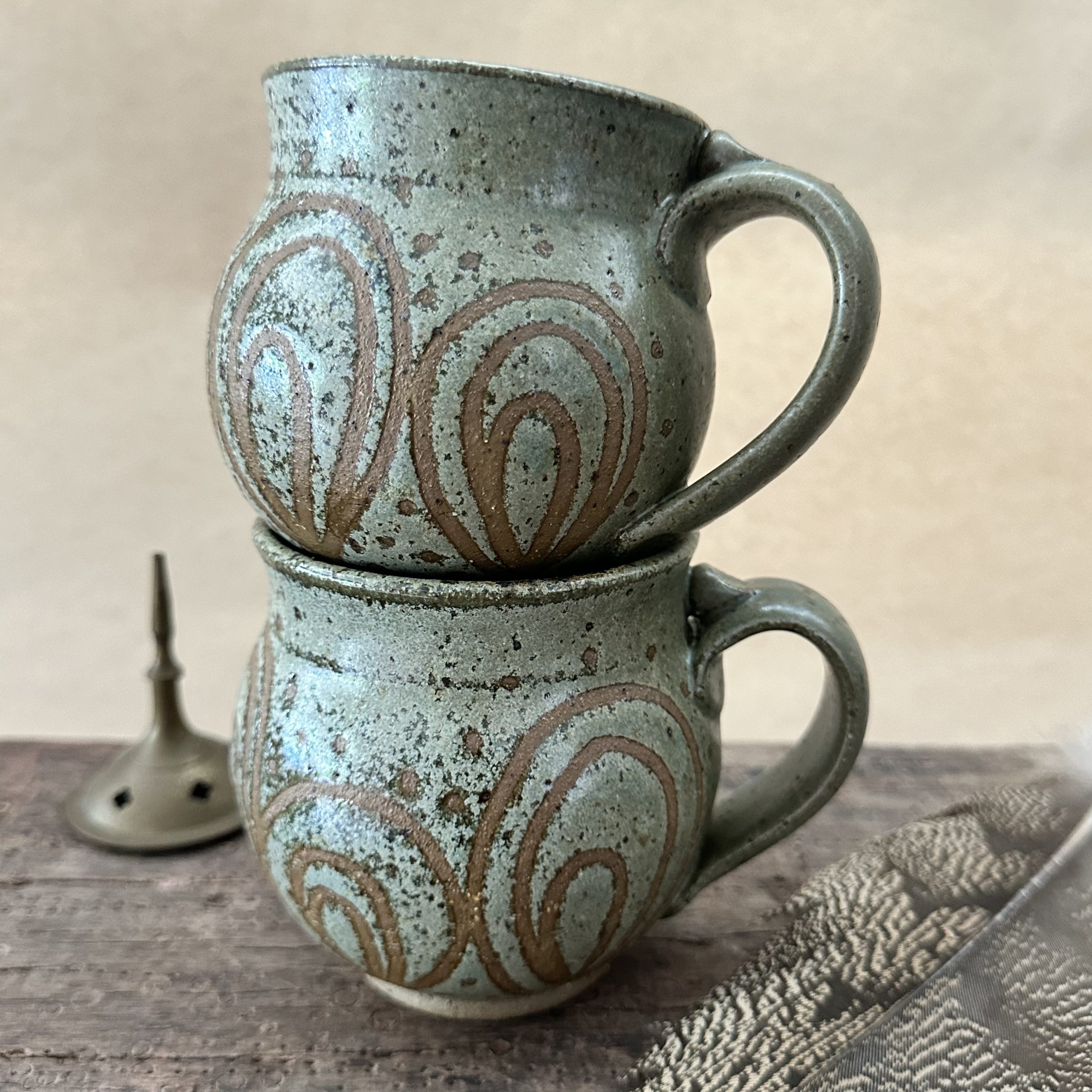 Beautiful curvy Goddess shaped mug glazed in new ‘Lichen’ glaze with peacock design.