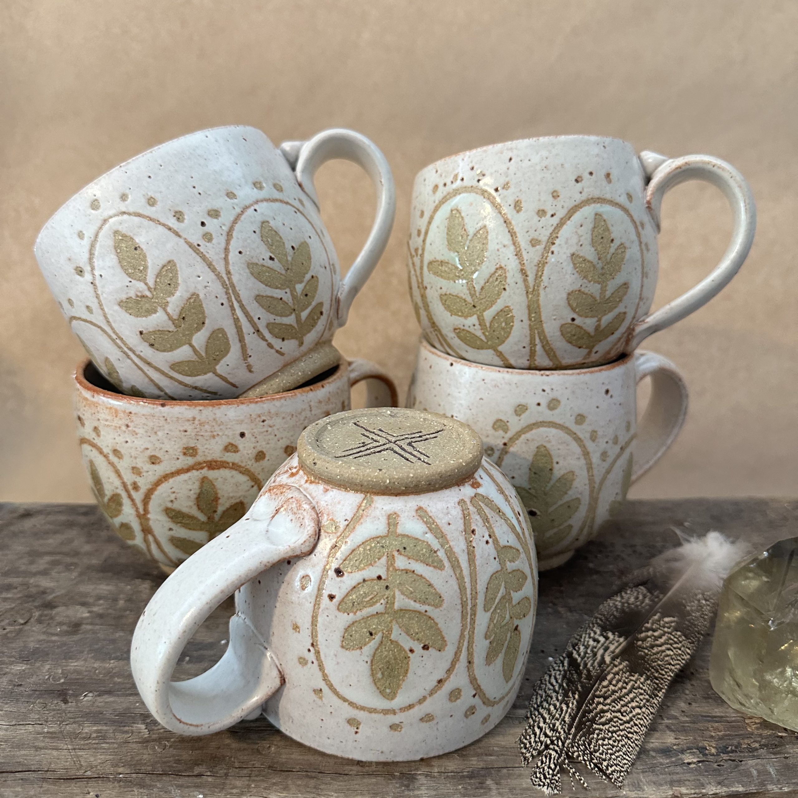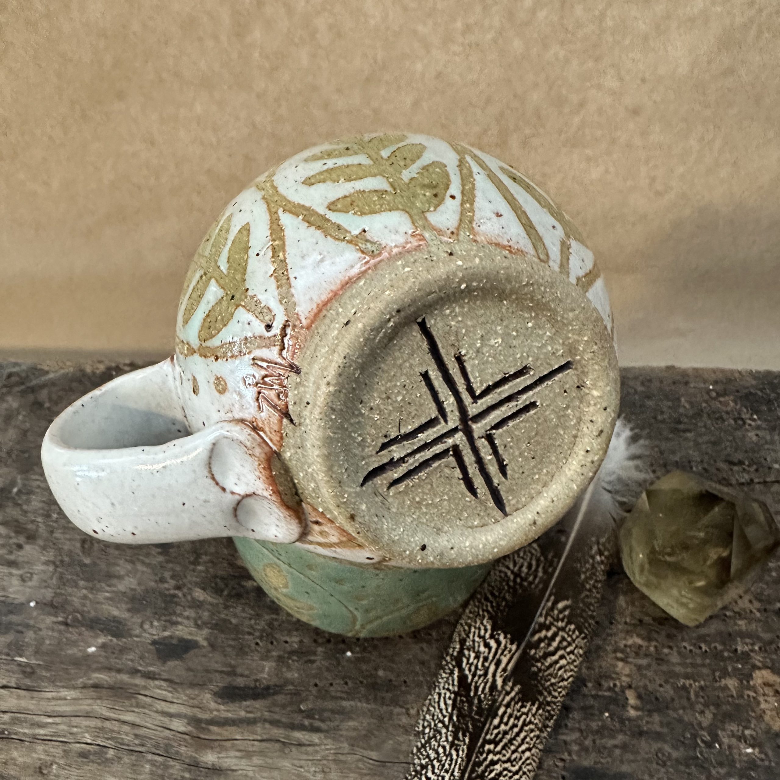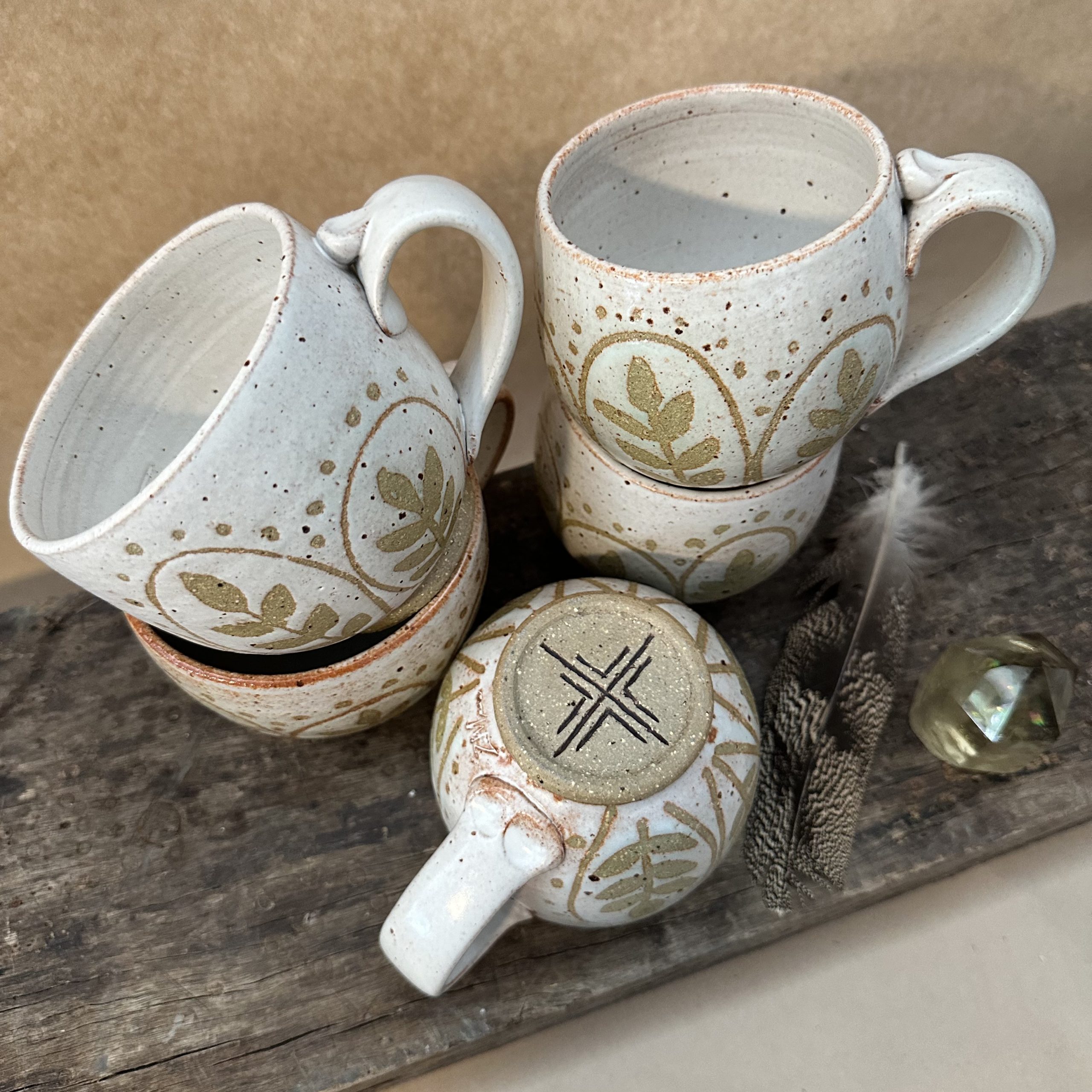 This mug is glazed in Sandstone white. The base has a beautiful carved symbol and has been sanded smooth so your surfaces will not get scratched.