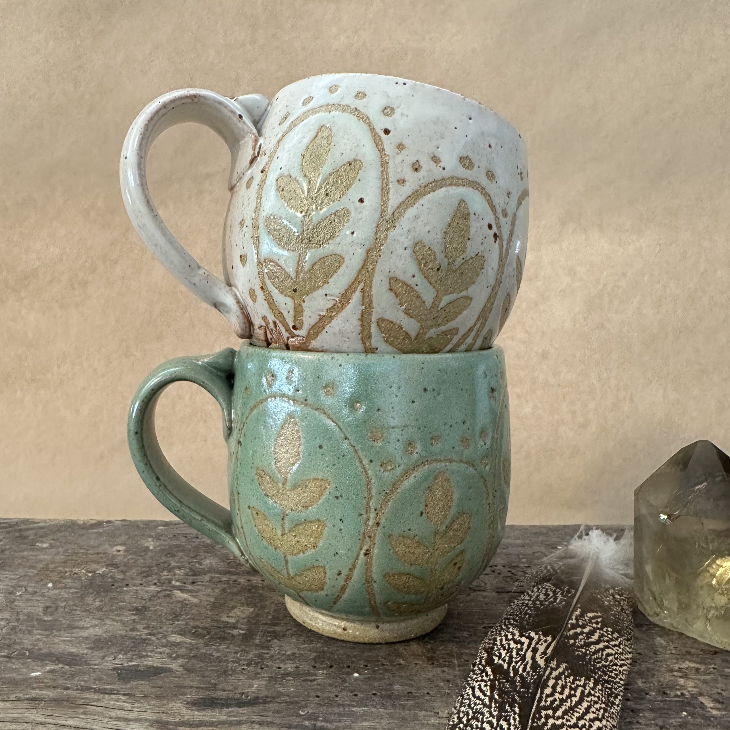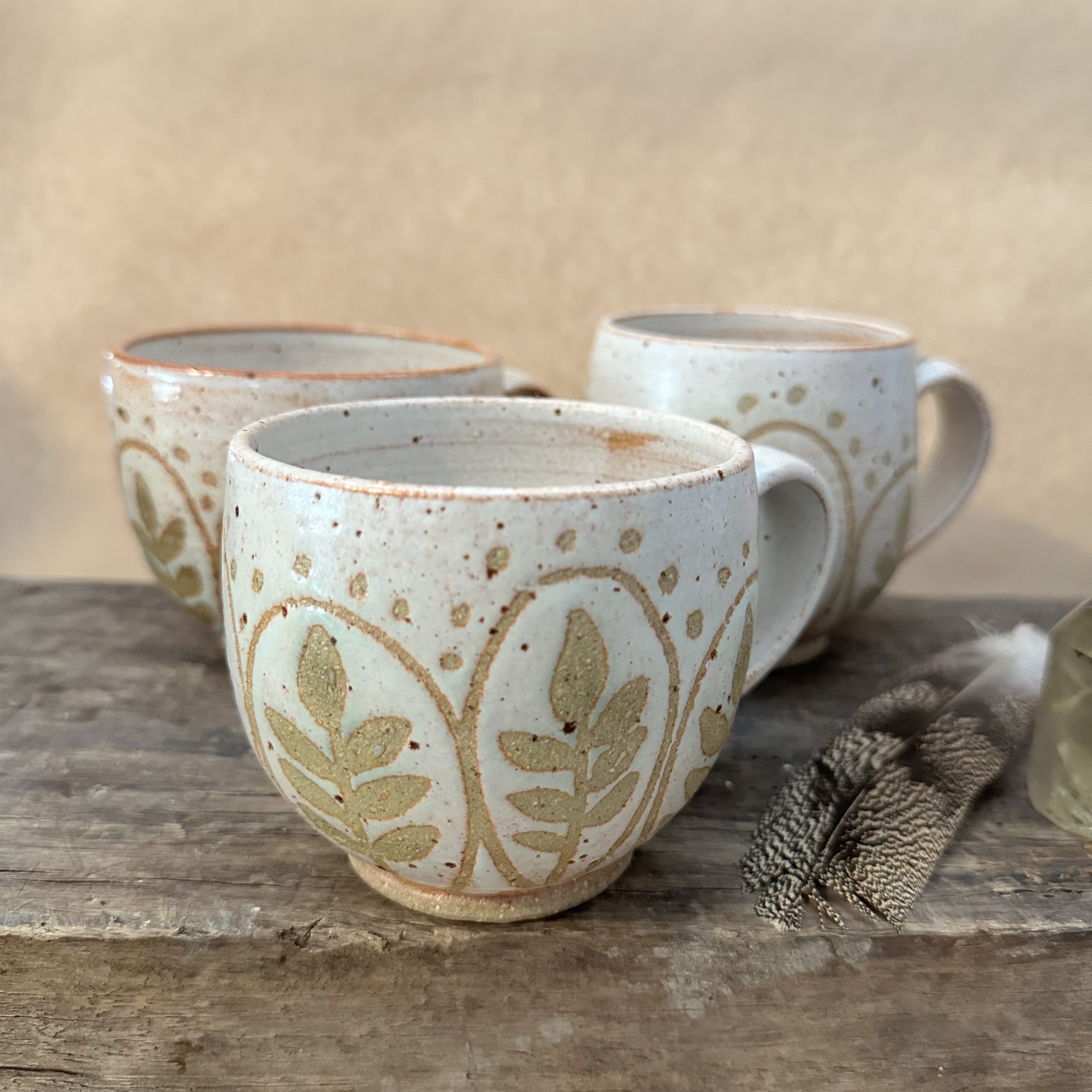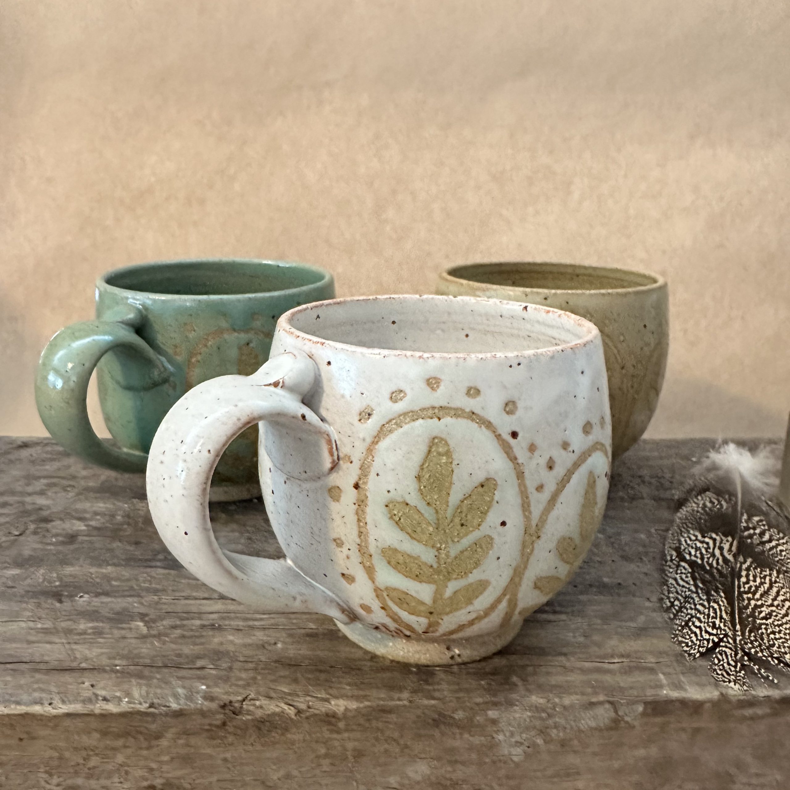 This mug is glazed in Sandstone white. The base has a beautiful carved symbol and has been sanded smooth so your surfaces will not get scratched.