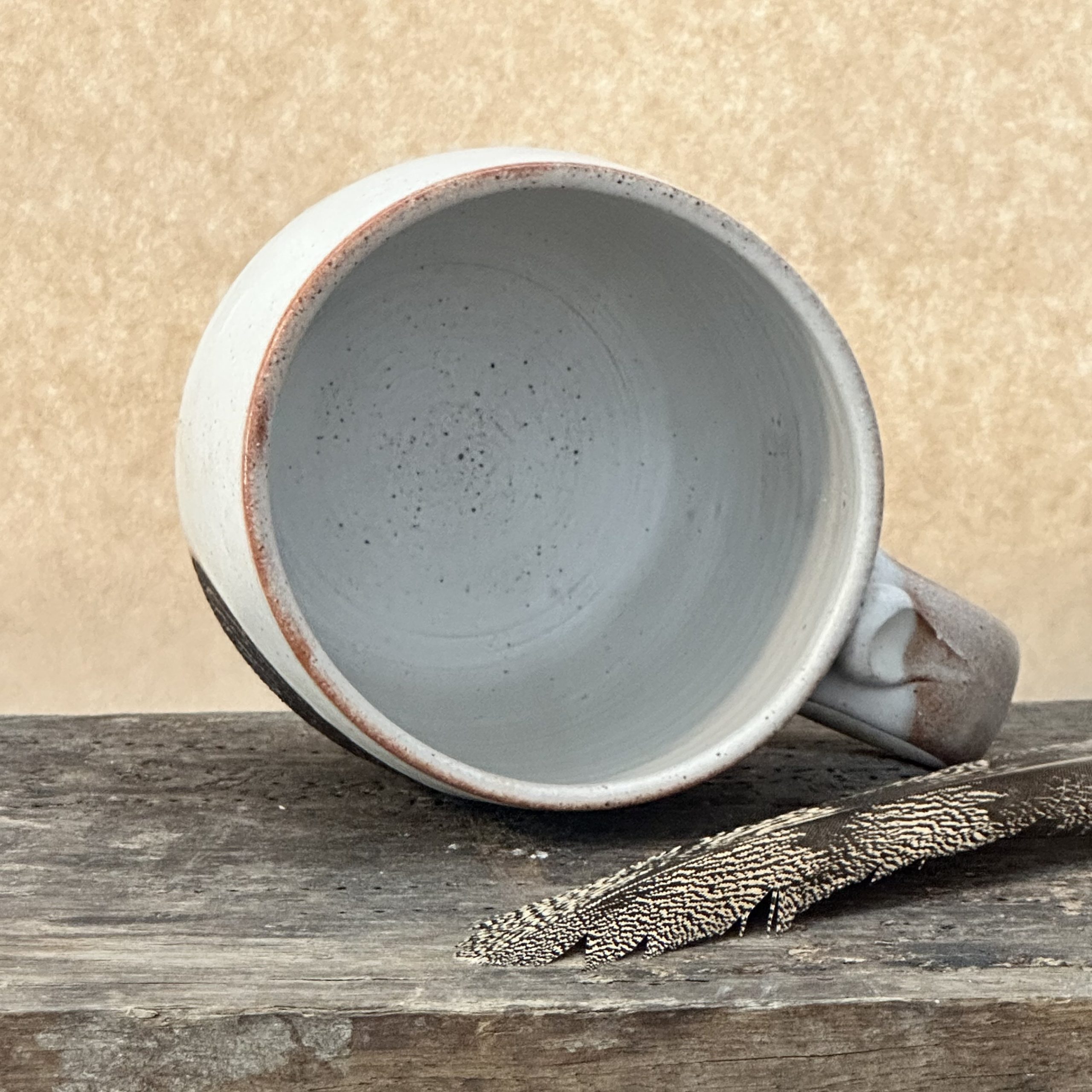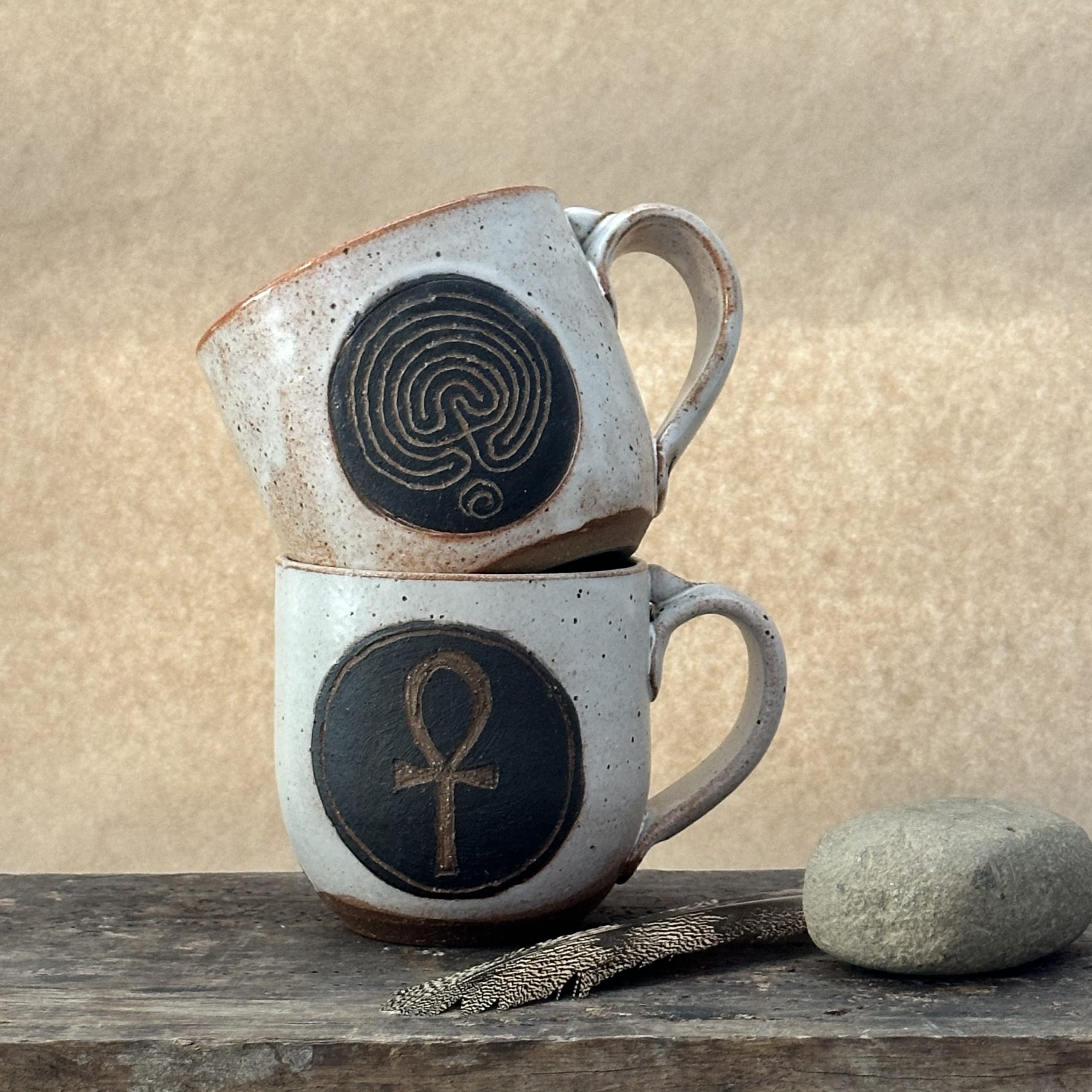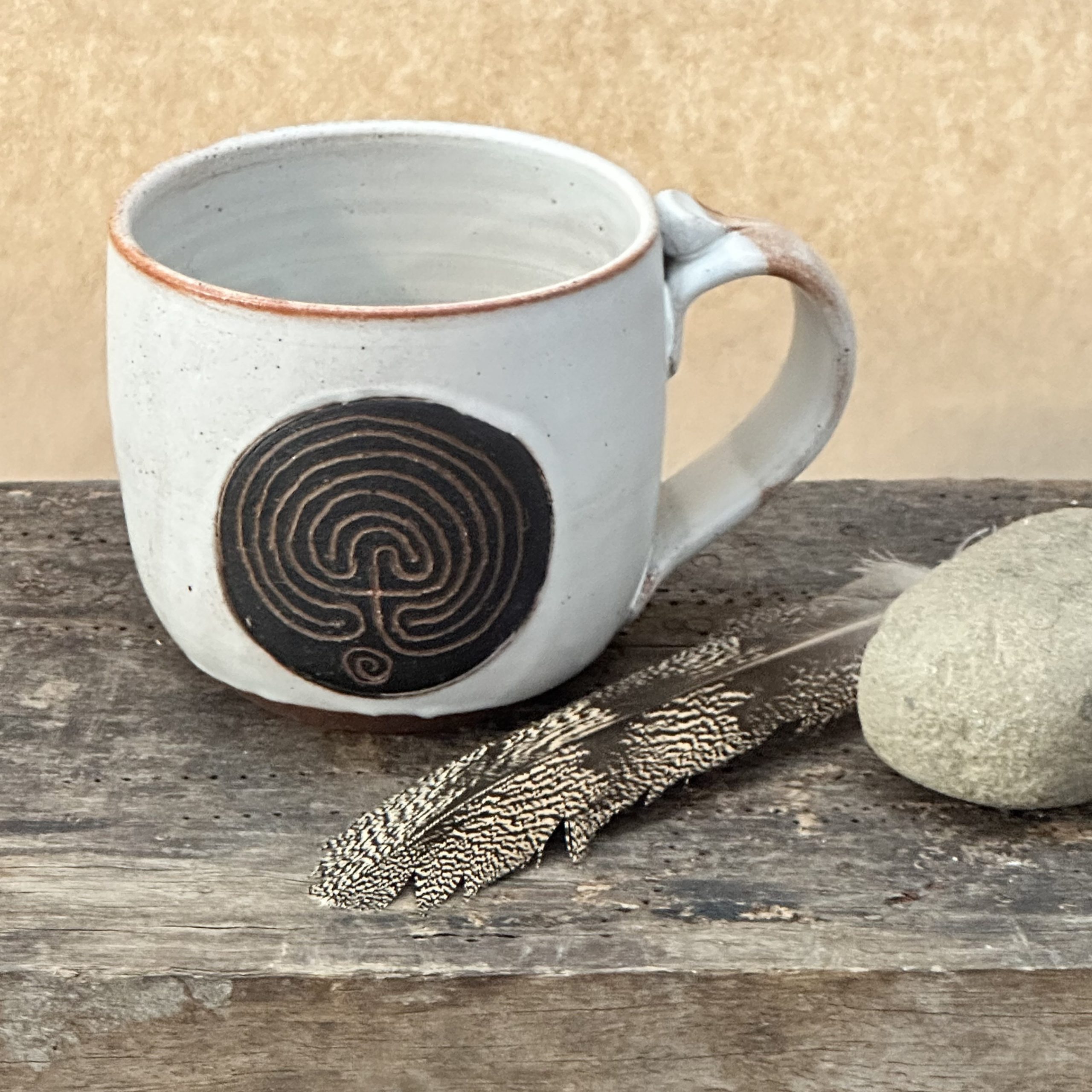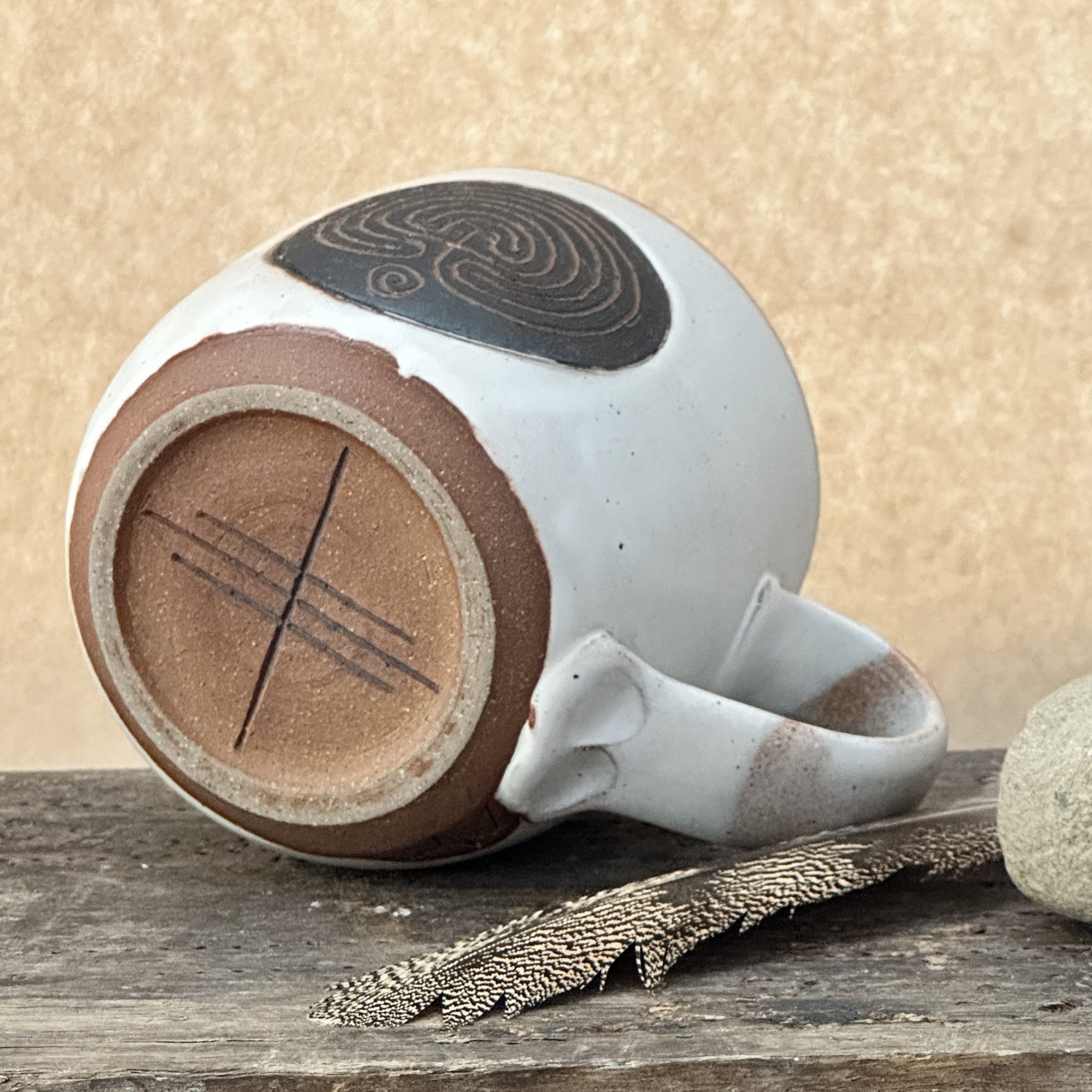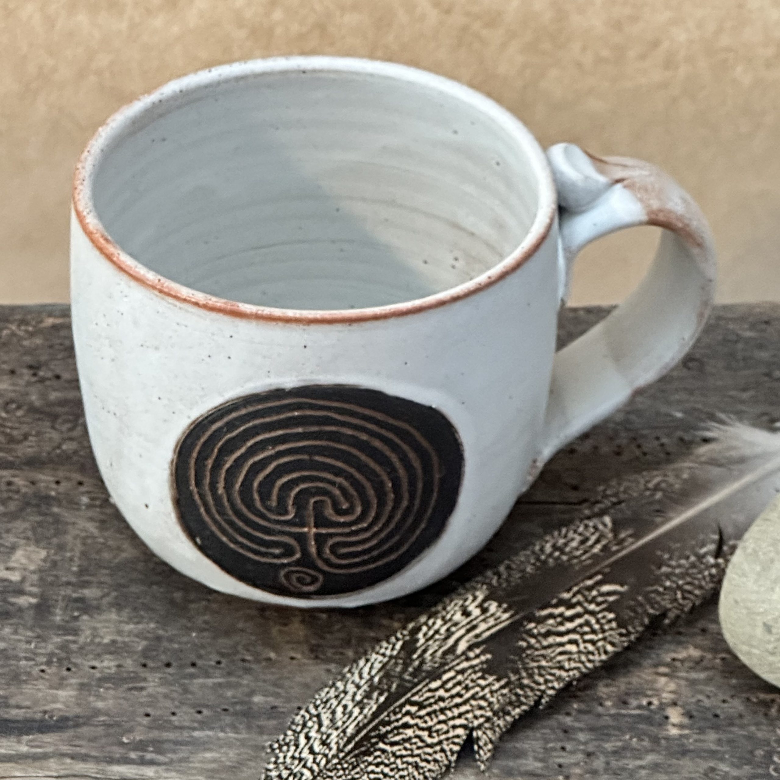 A medium size mug glazed in Sandstone, featuring a dark brown slip circle with a hand carved Labyrinth symbol.