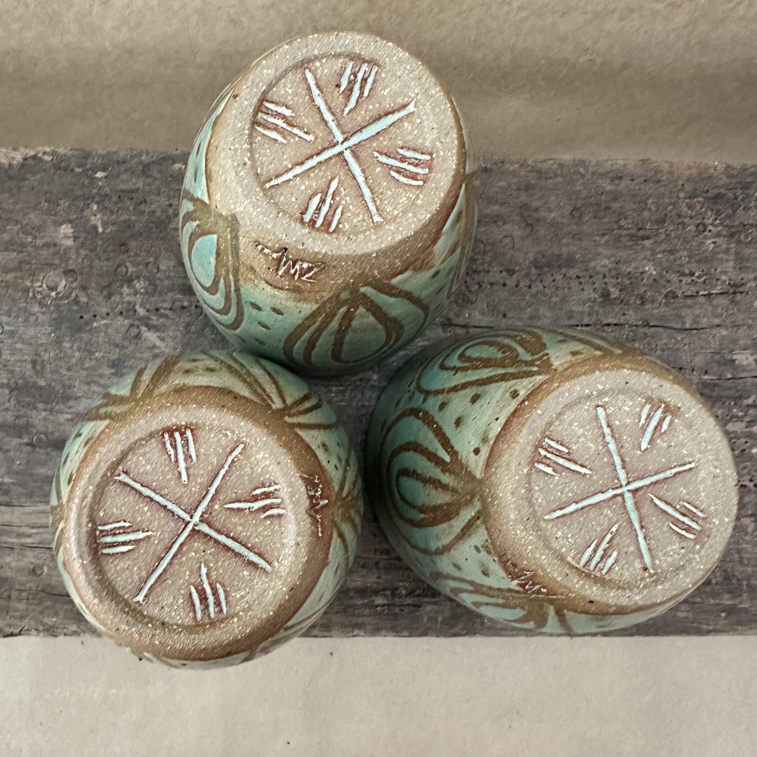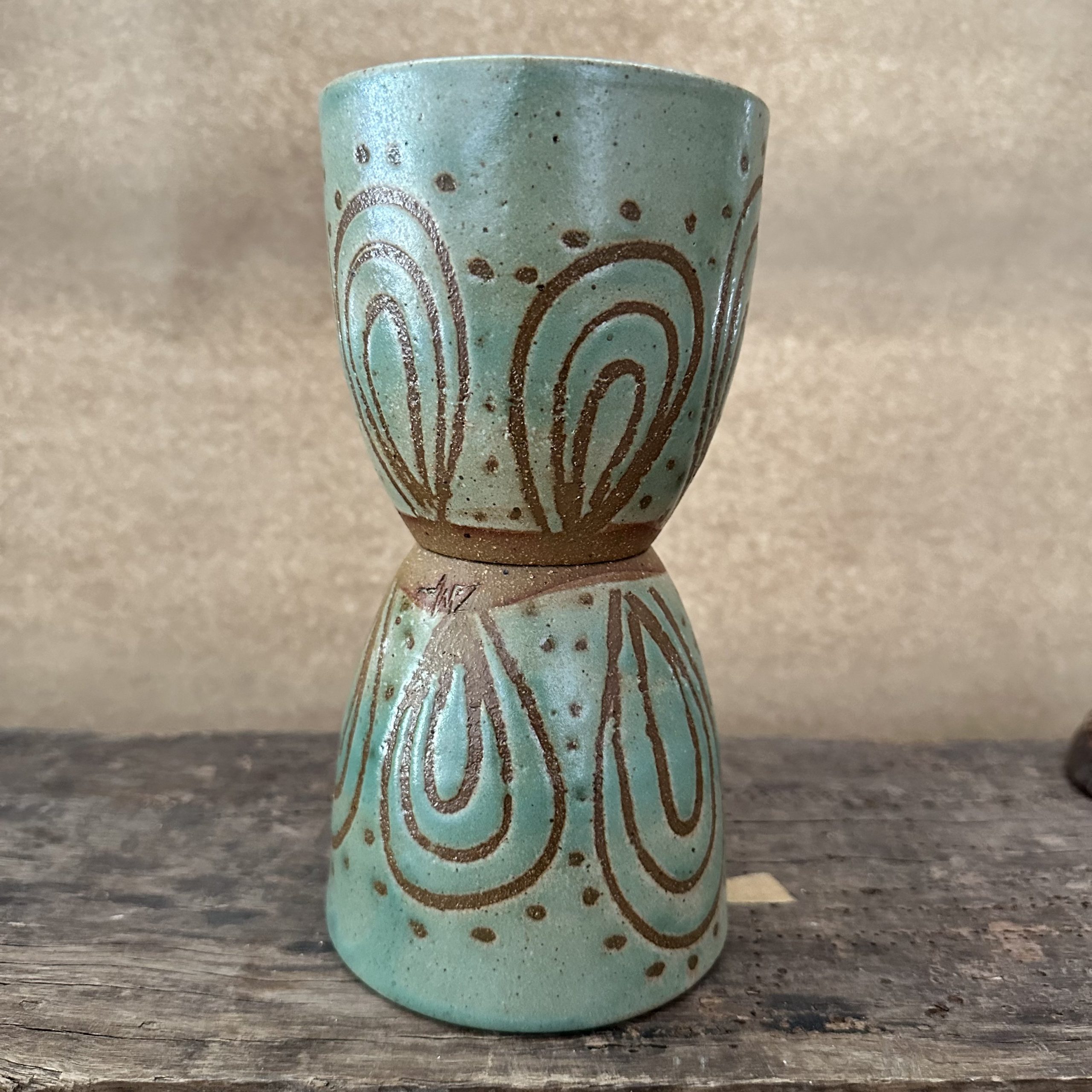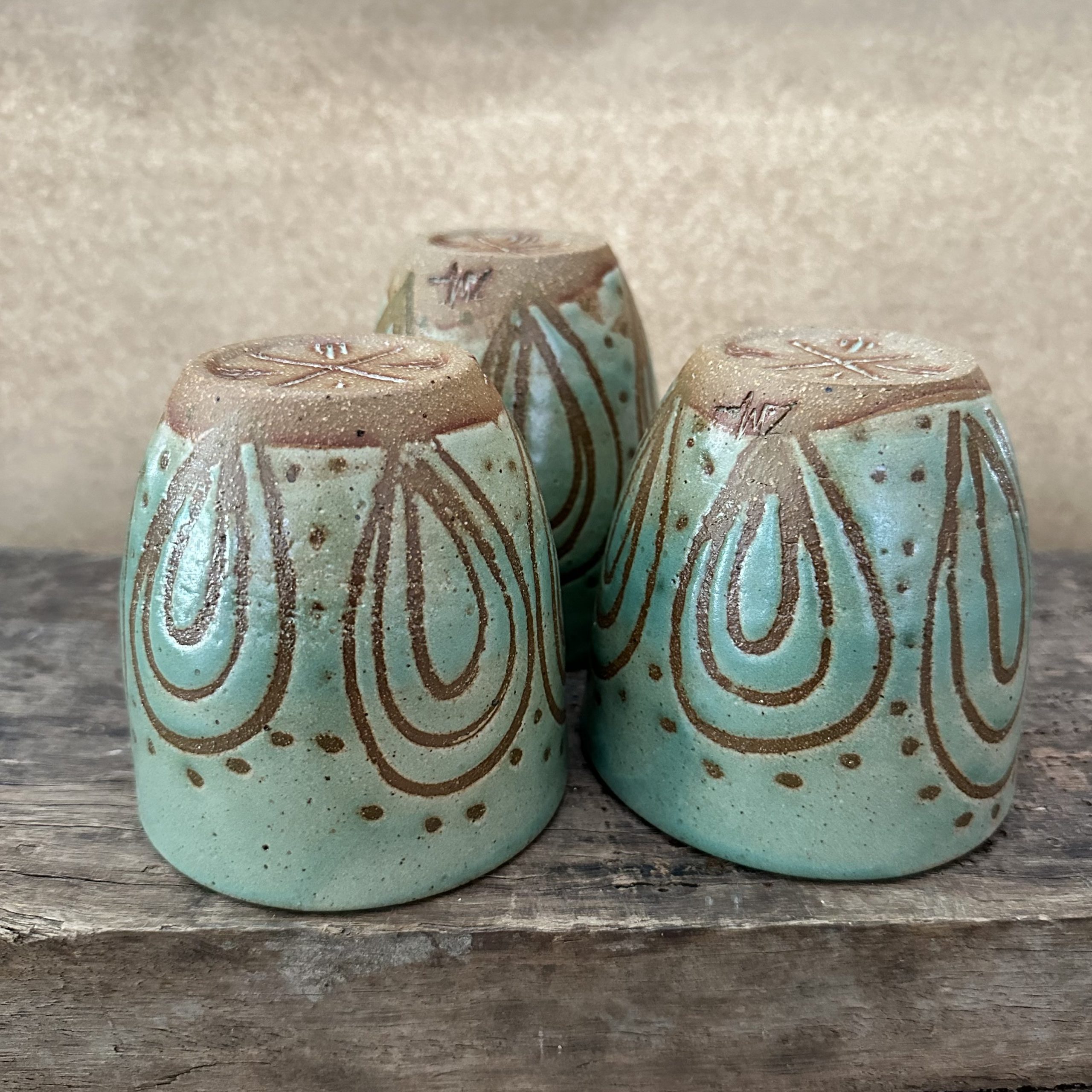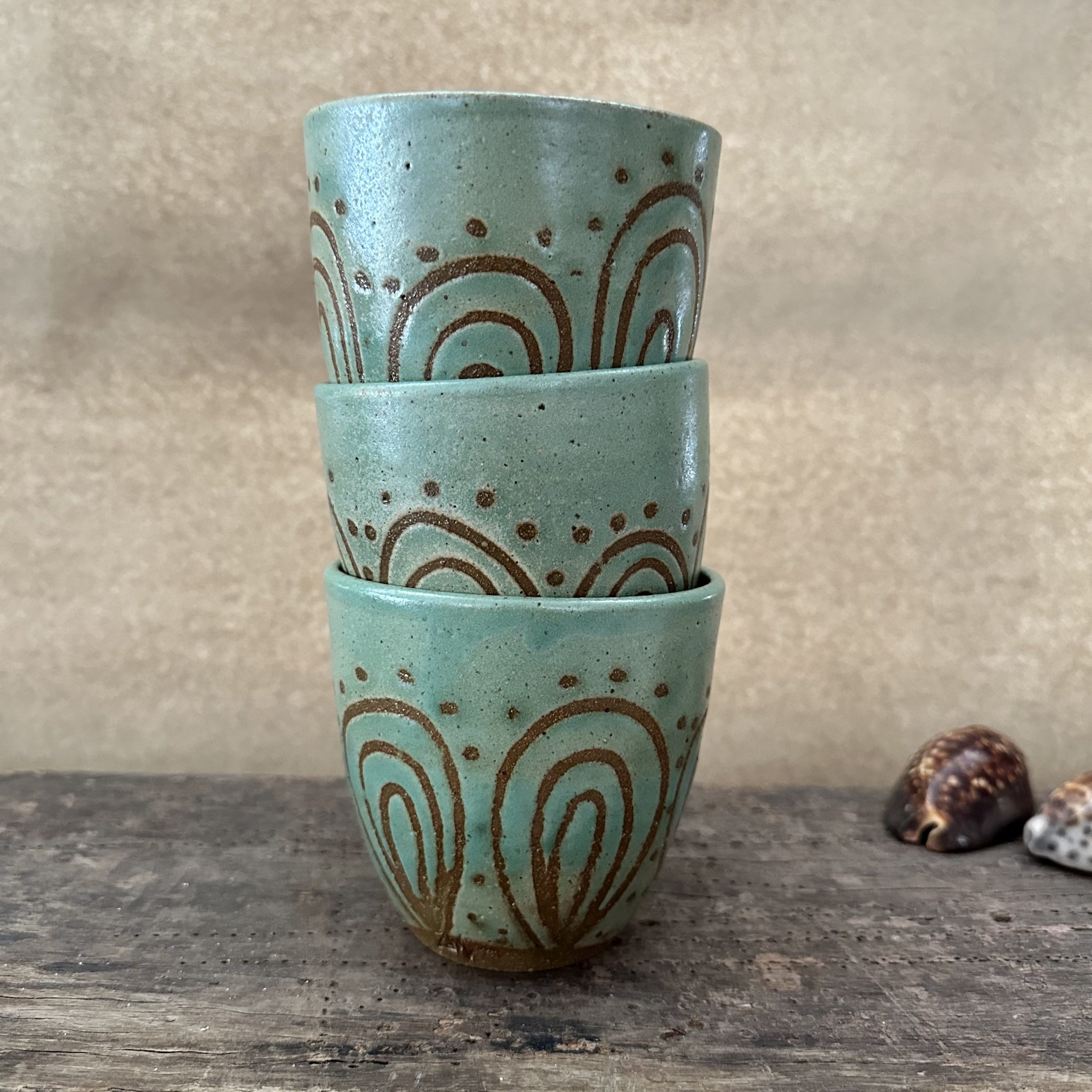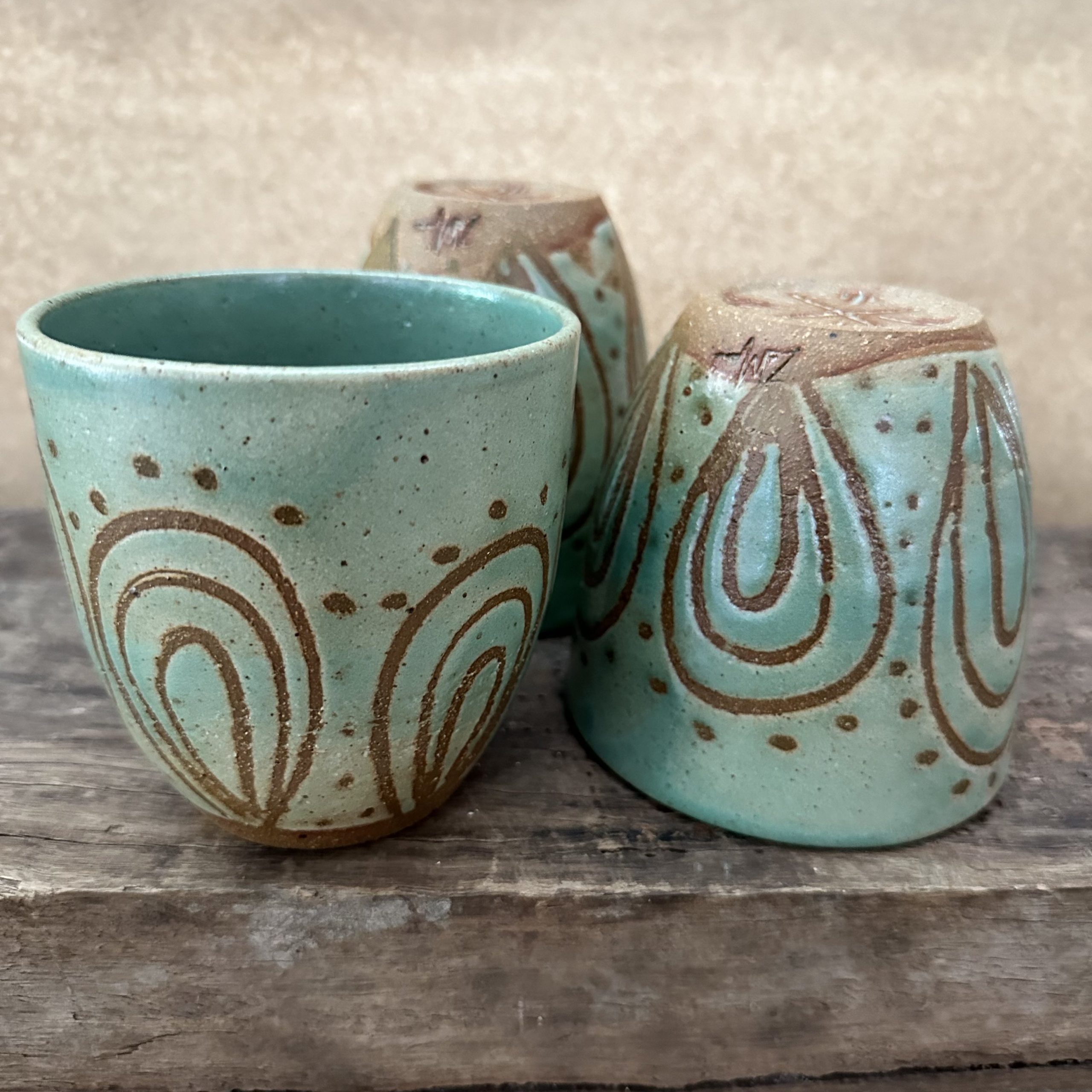 A lovely tumber (no handler) Glazed in Green Earth and decorated with peacock design.