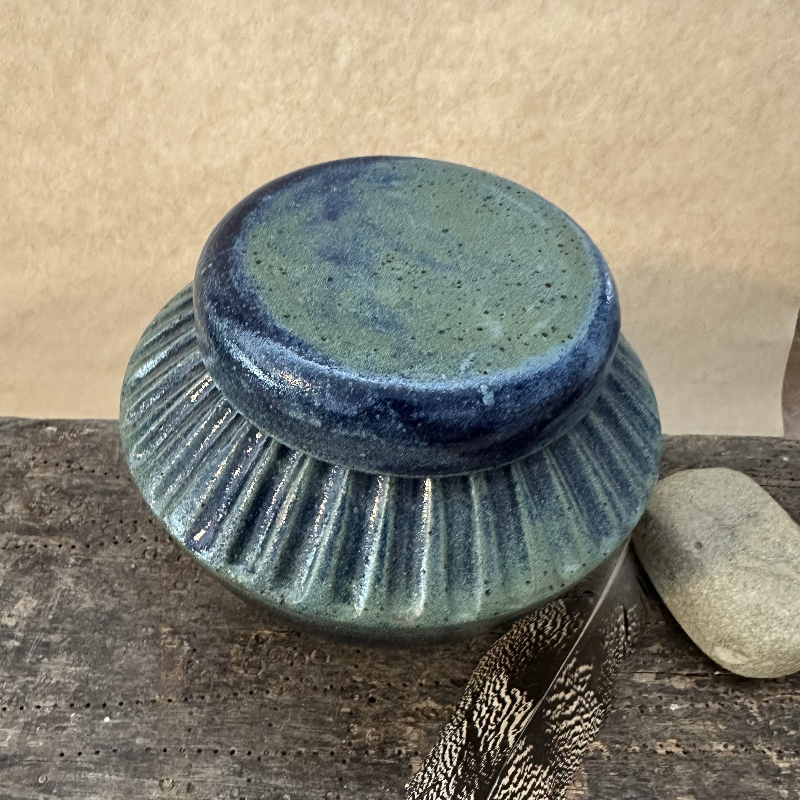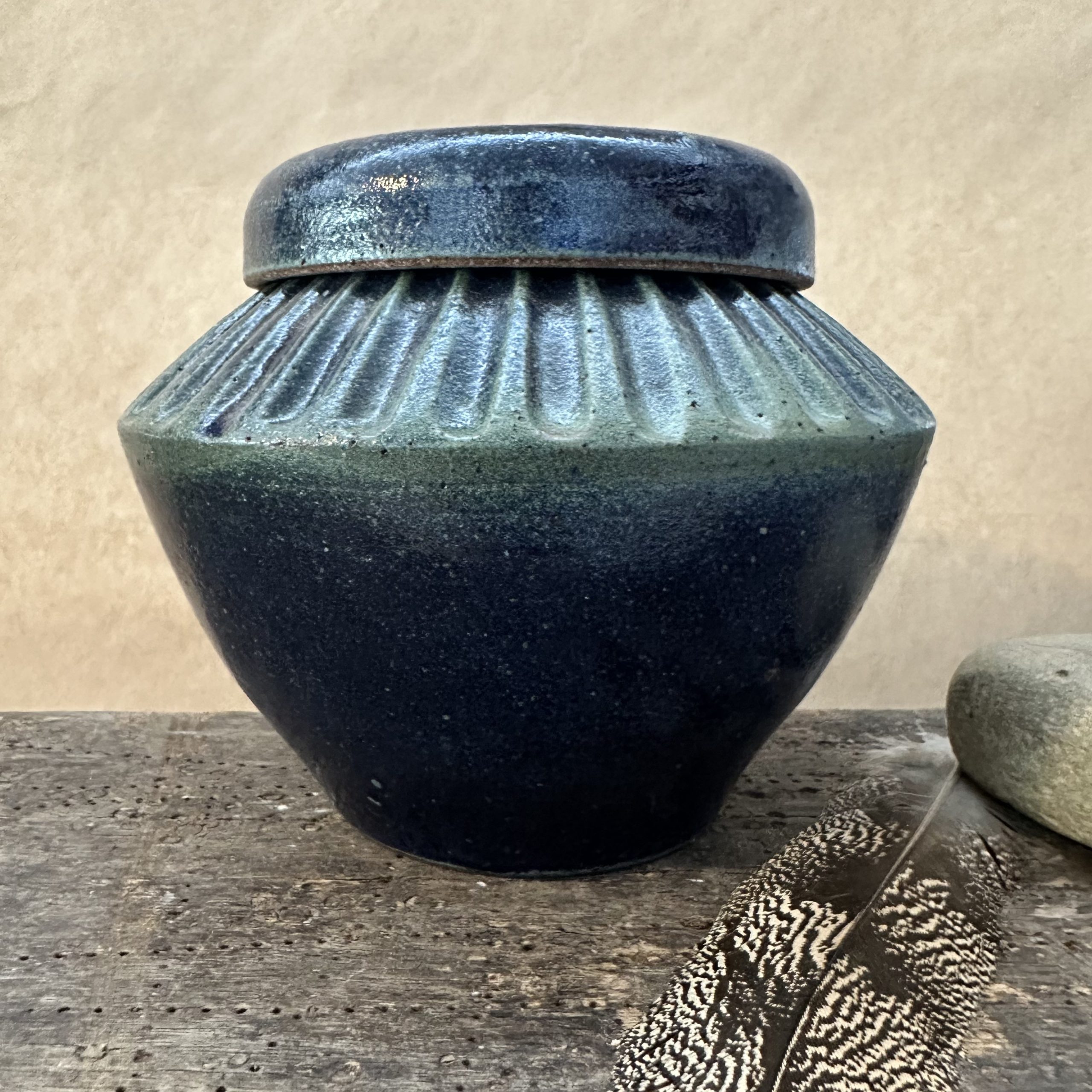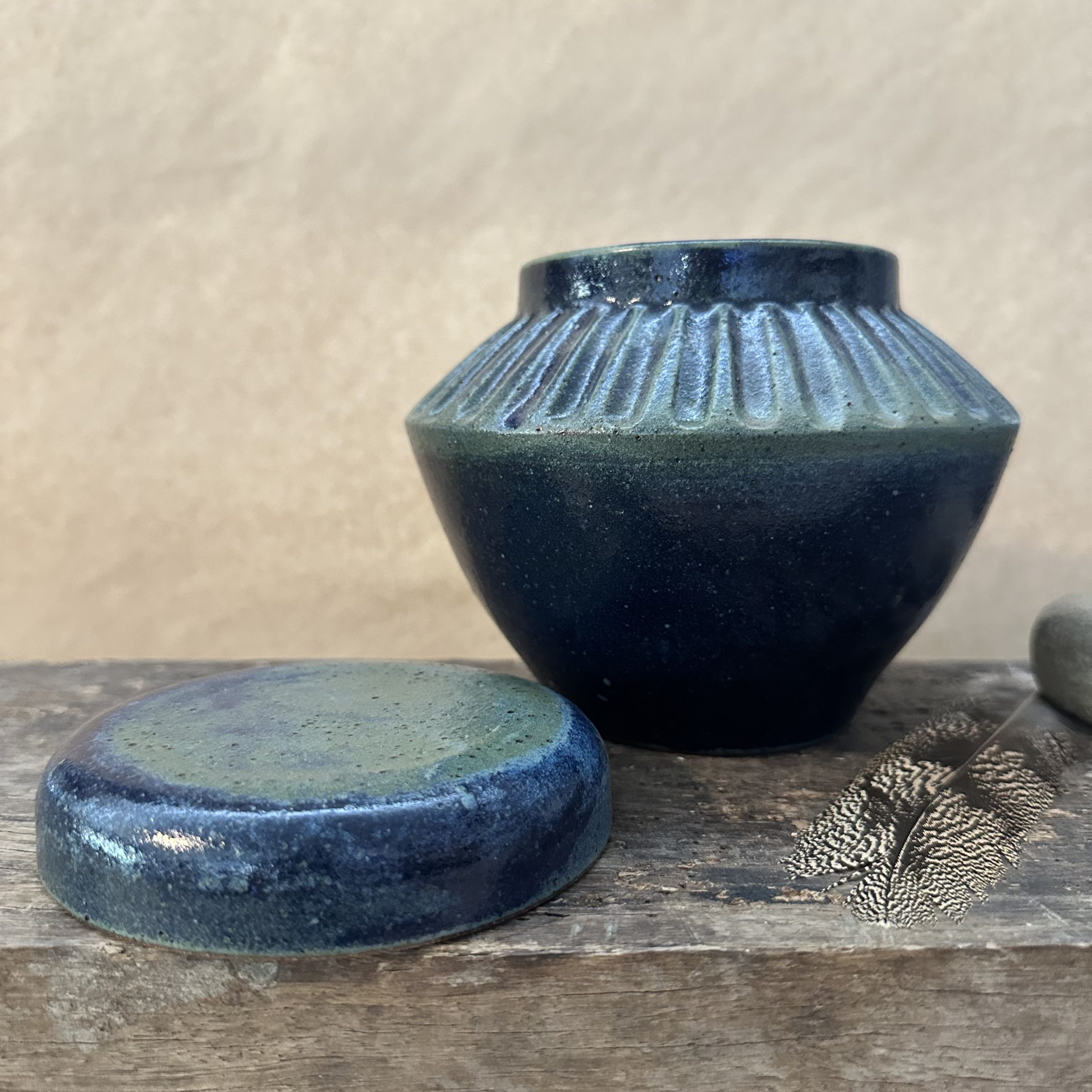 A beautiful one off lidded jar. Can be used to hold all sorts of treasures. Sometimes these jars are used for Cremation Ashes.