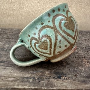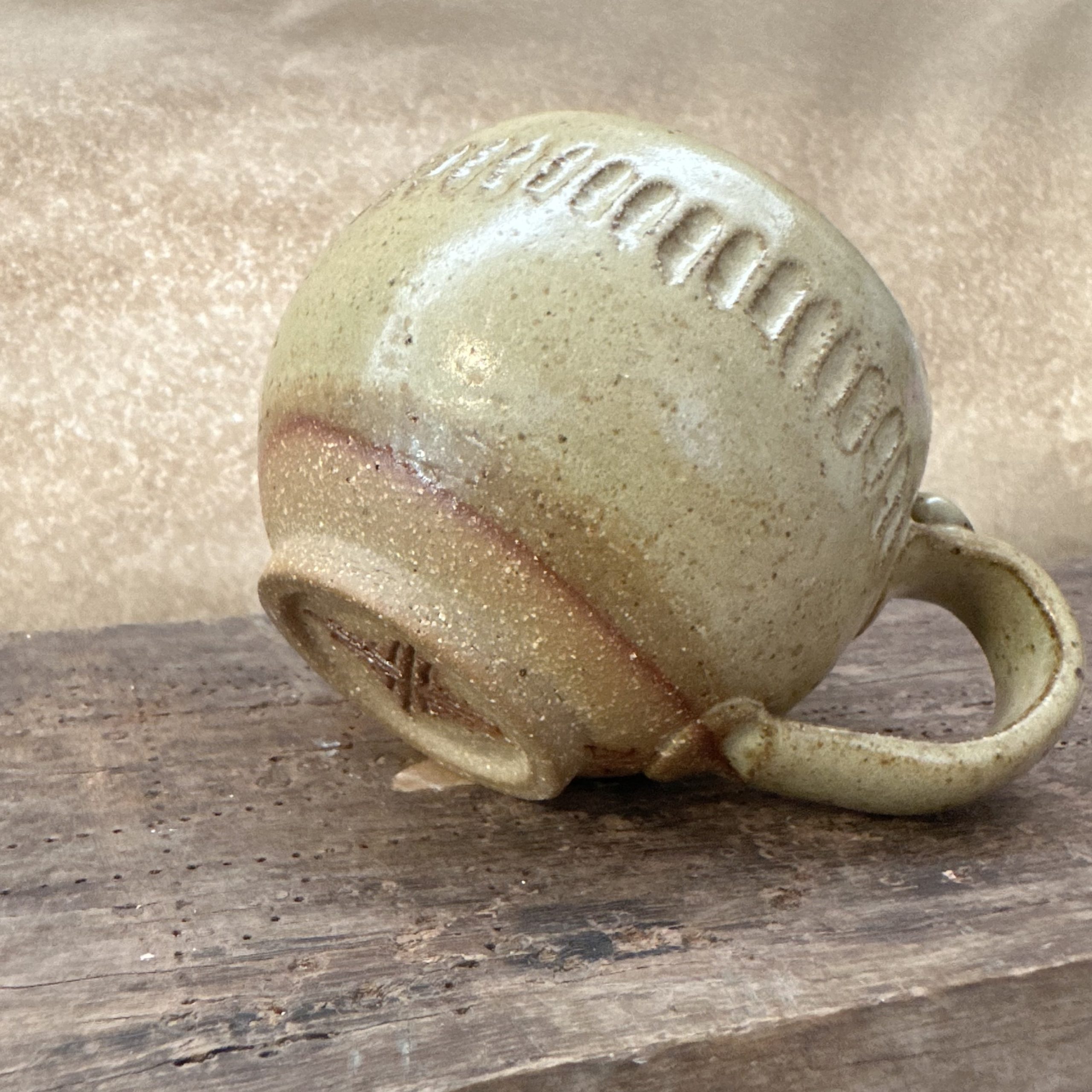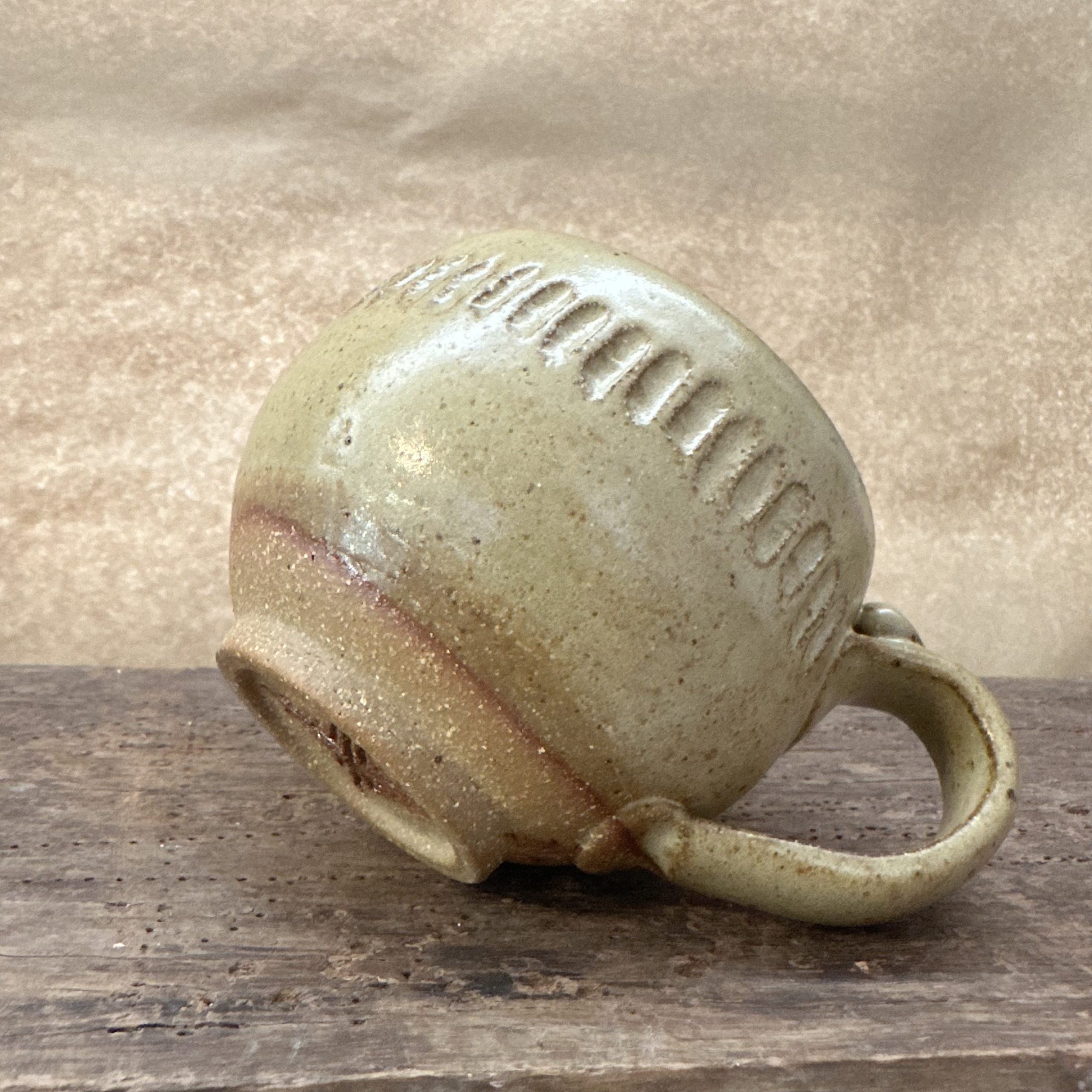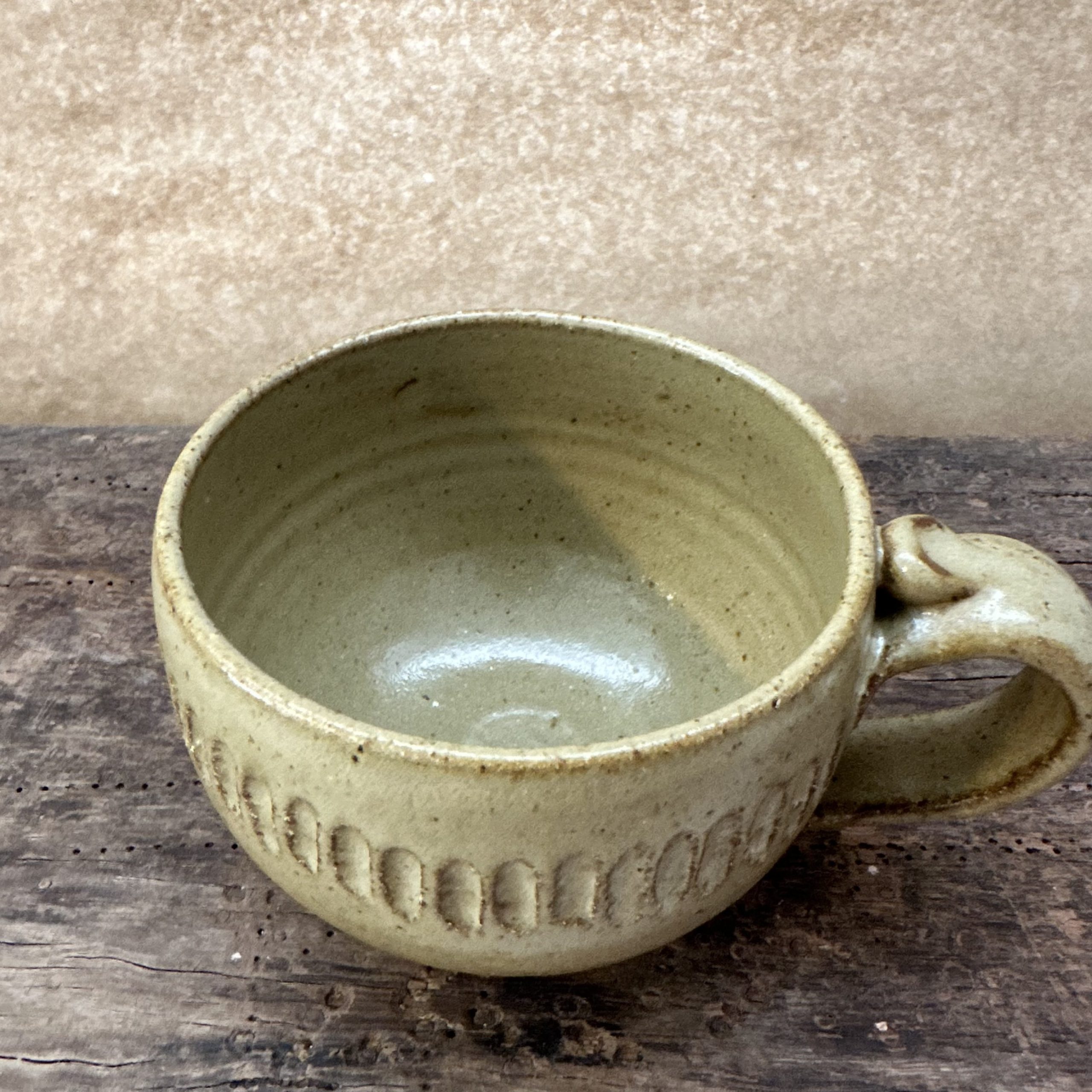 A one off mug glazed in Stone with a carved detail around the side.