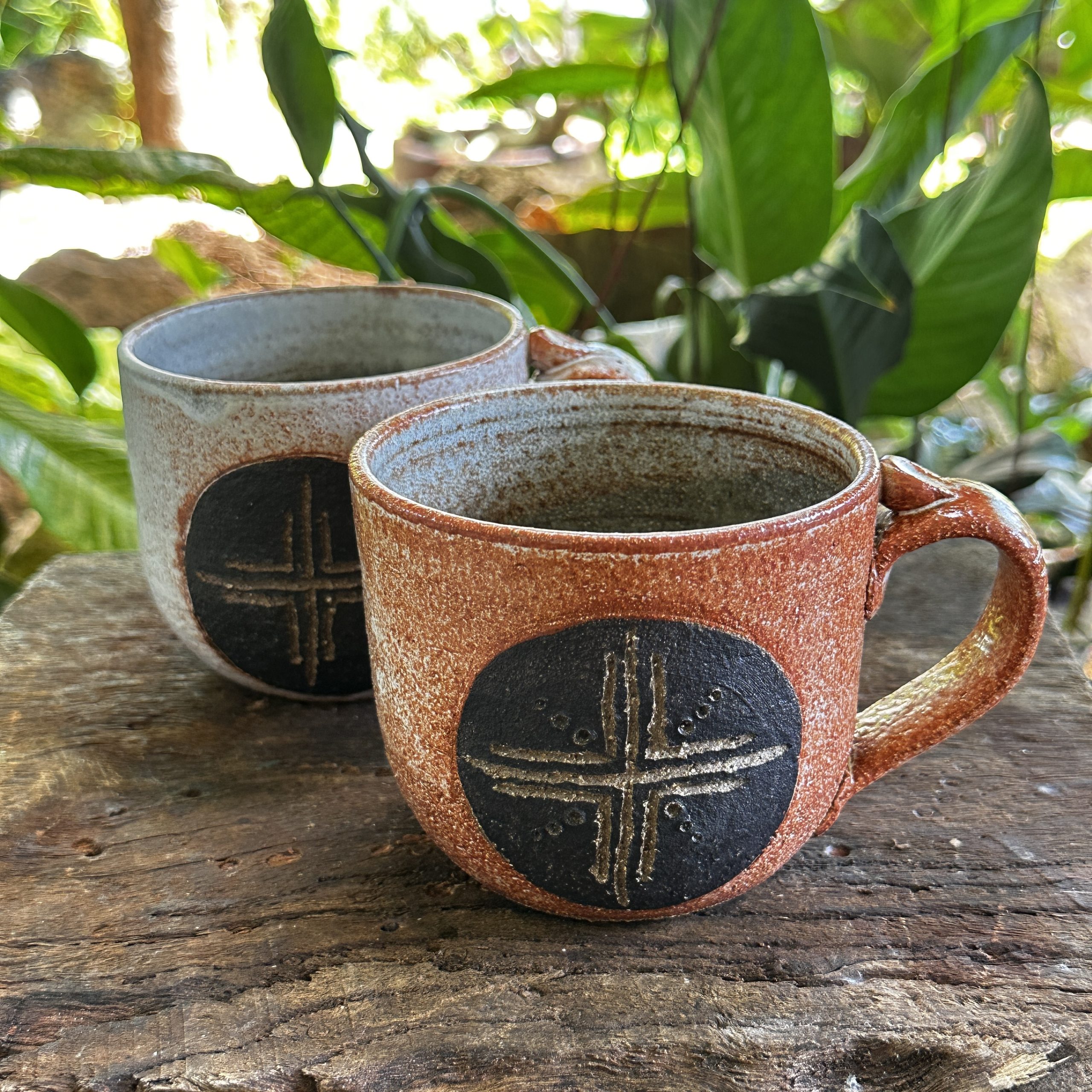 Thrown by hand on the wheel and hand carved. This product is for the more orange coloured mug.