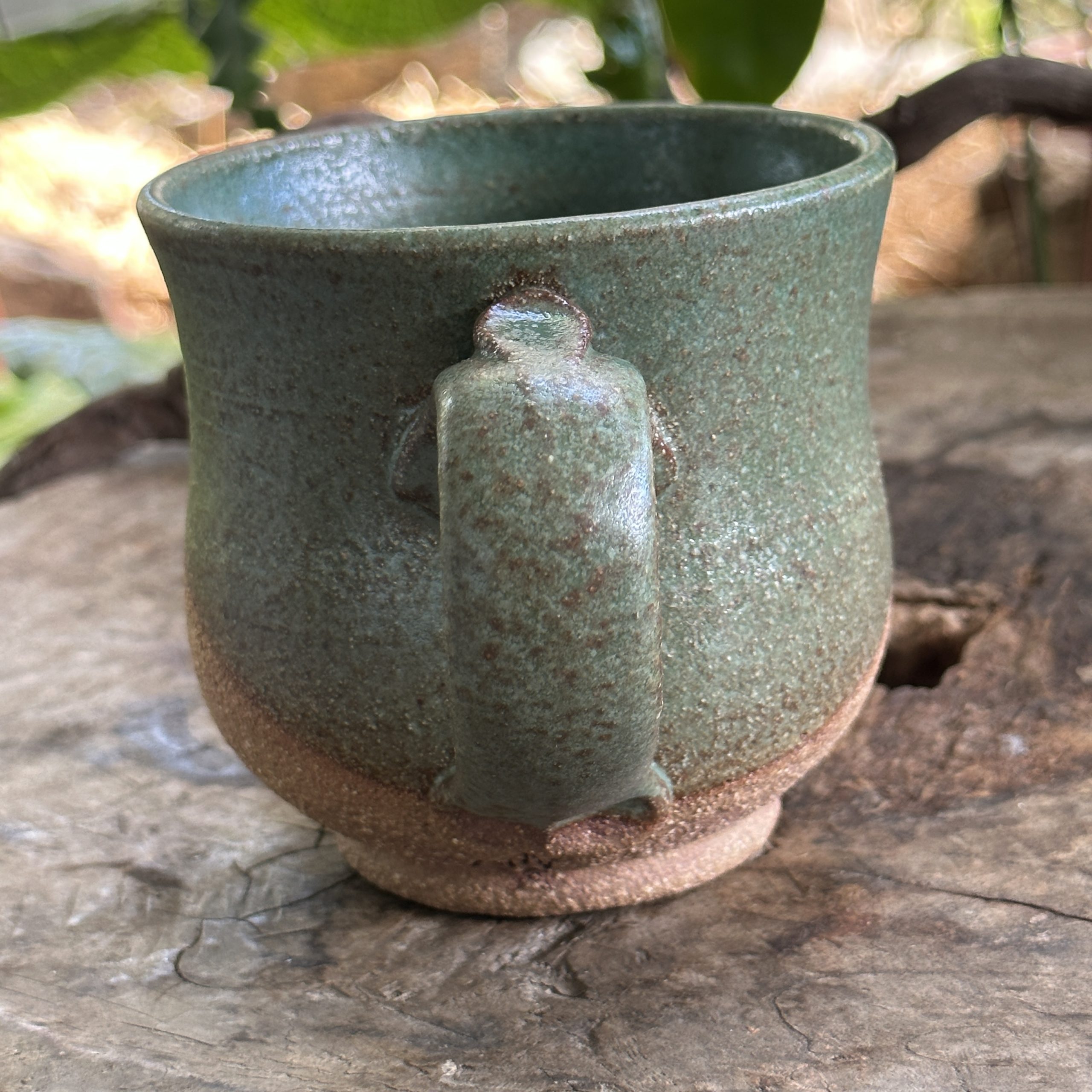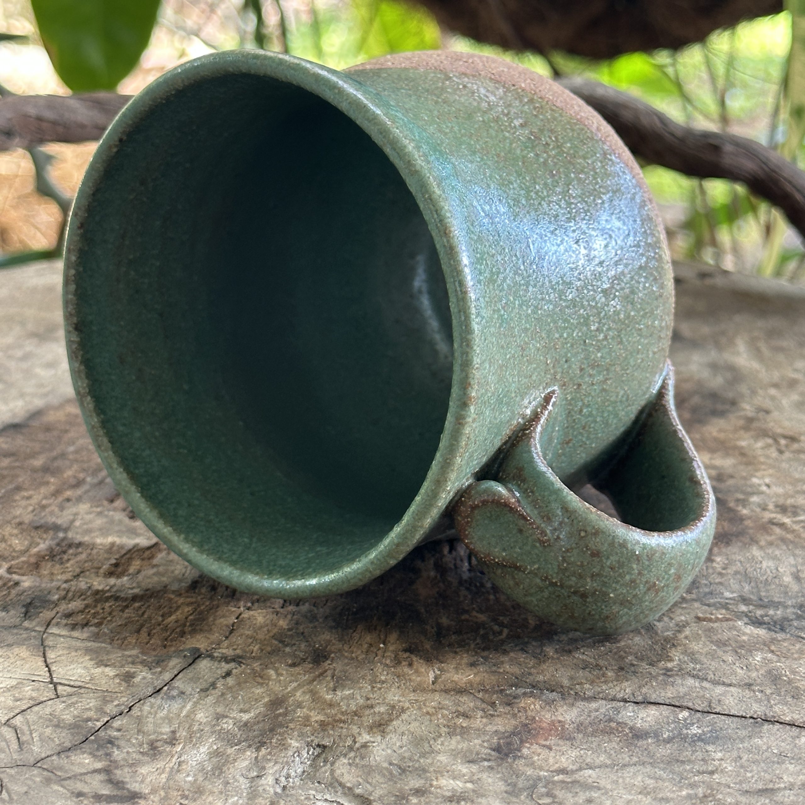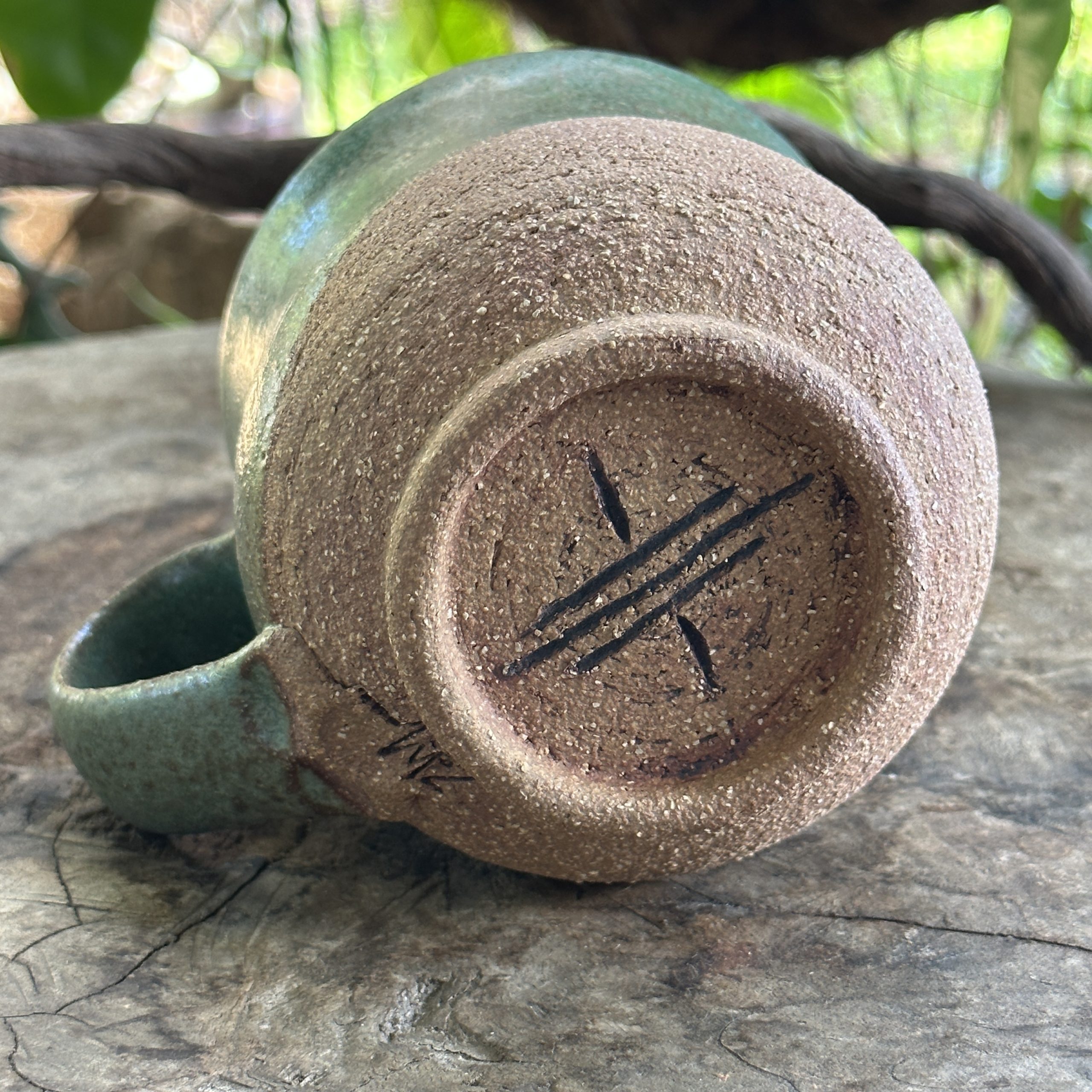 A medium to large size mug with a base that has been carved with a symbol to enhance your experience. Glazed in Green.