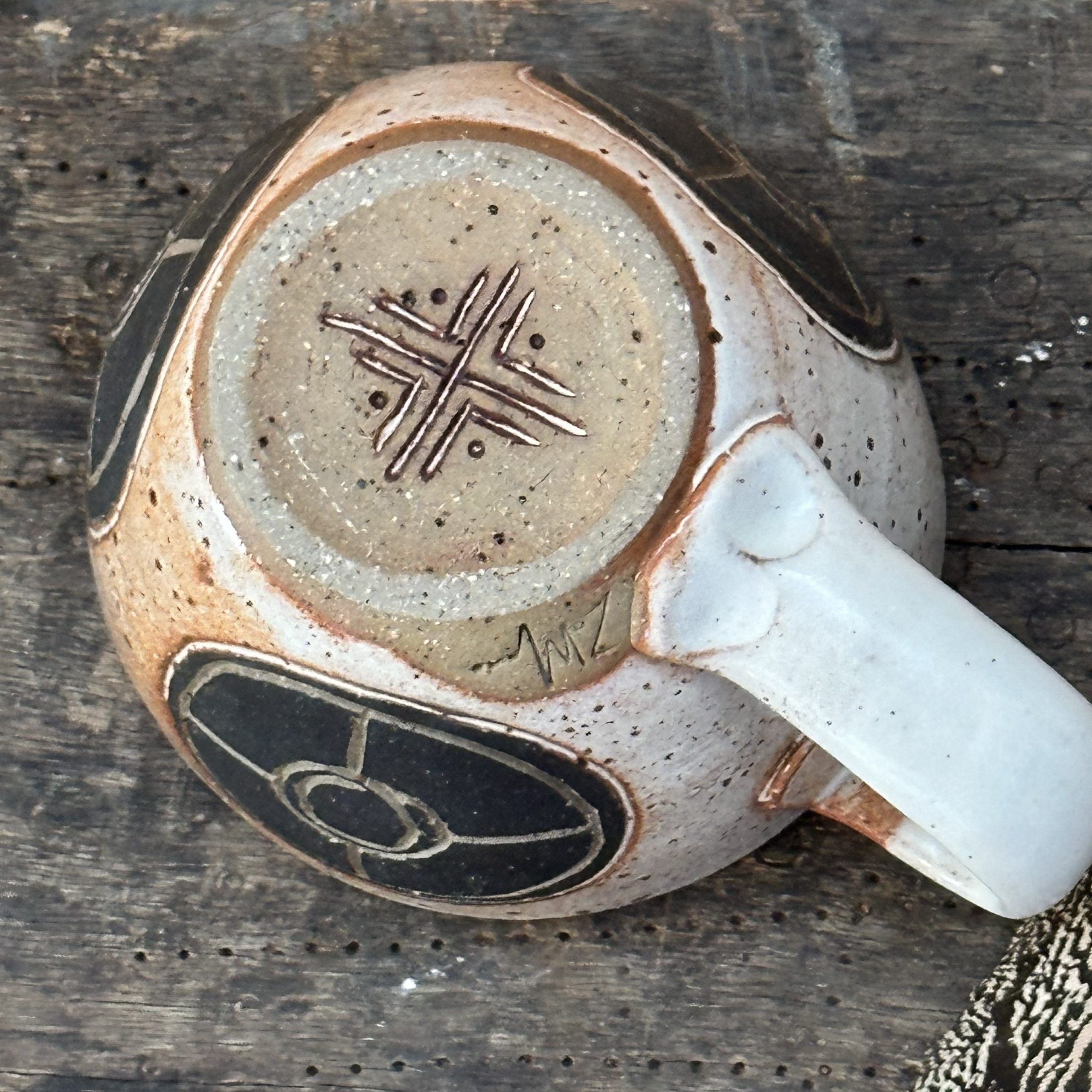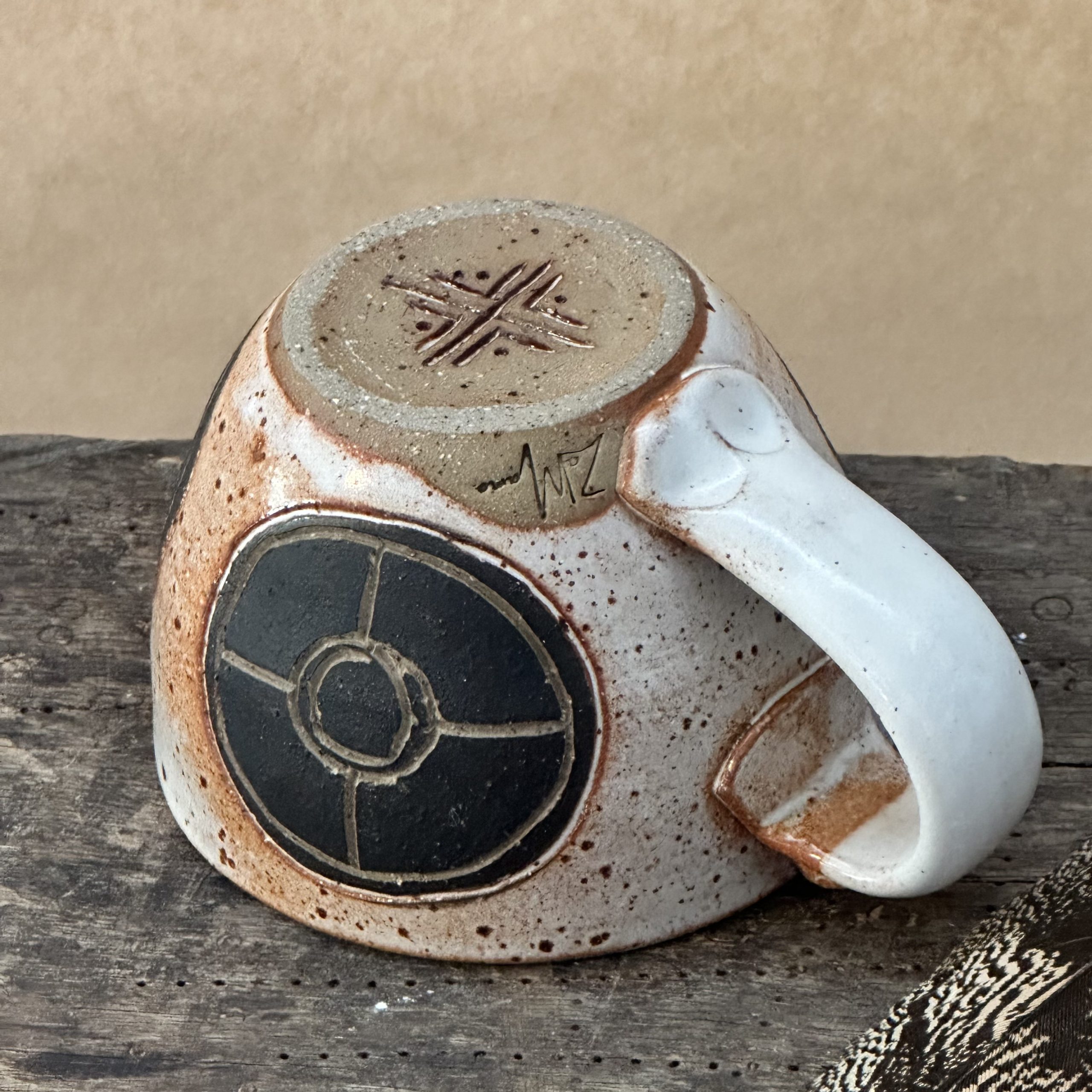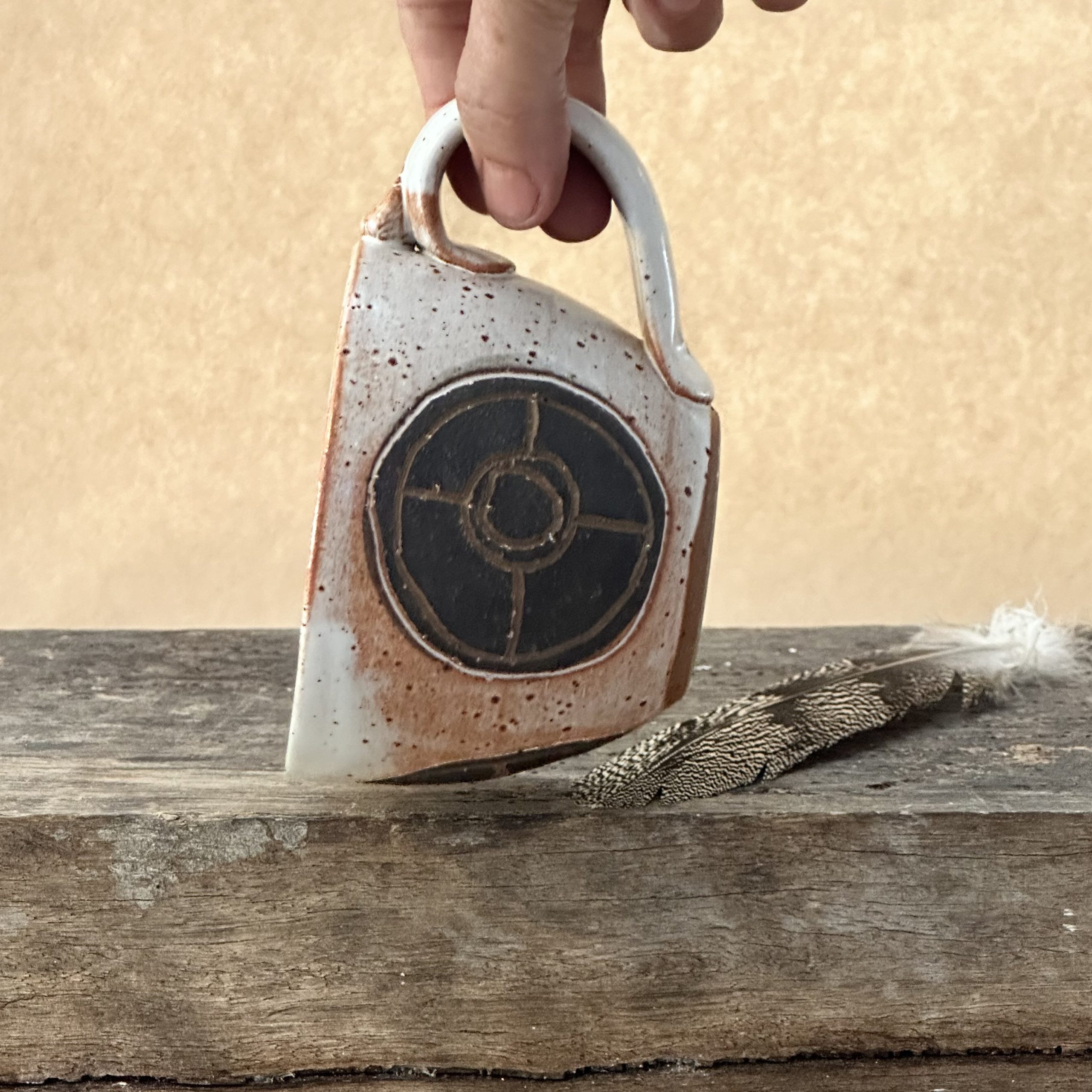 A small size mug with 3 carved motifs on the side. This mug is glazed in Sandstone.