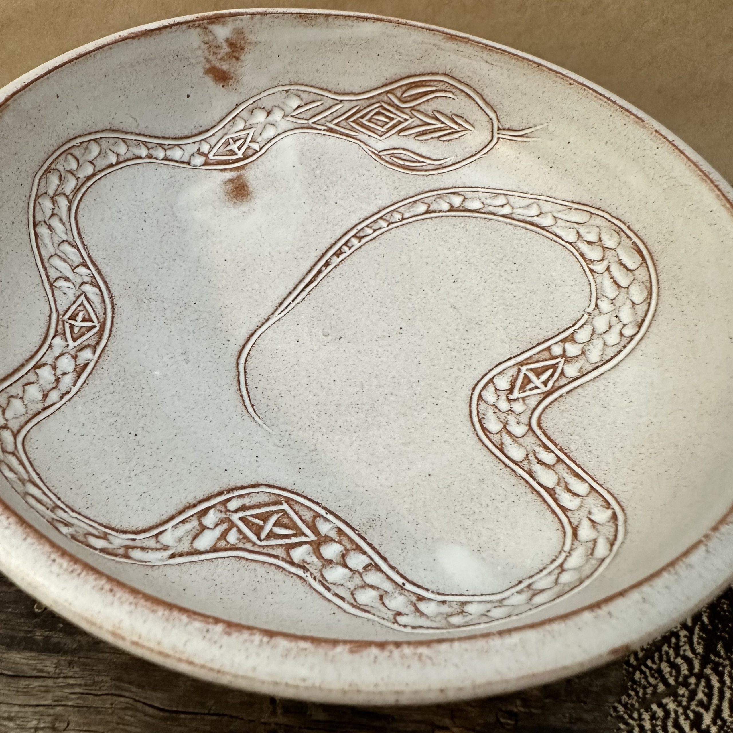 Small bowl carved with a snake, glazed in Sandstone glaze.