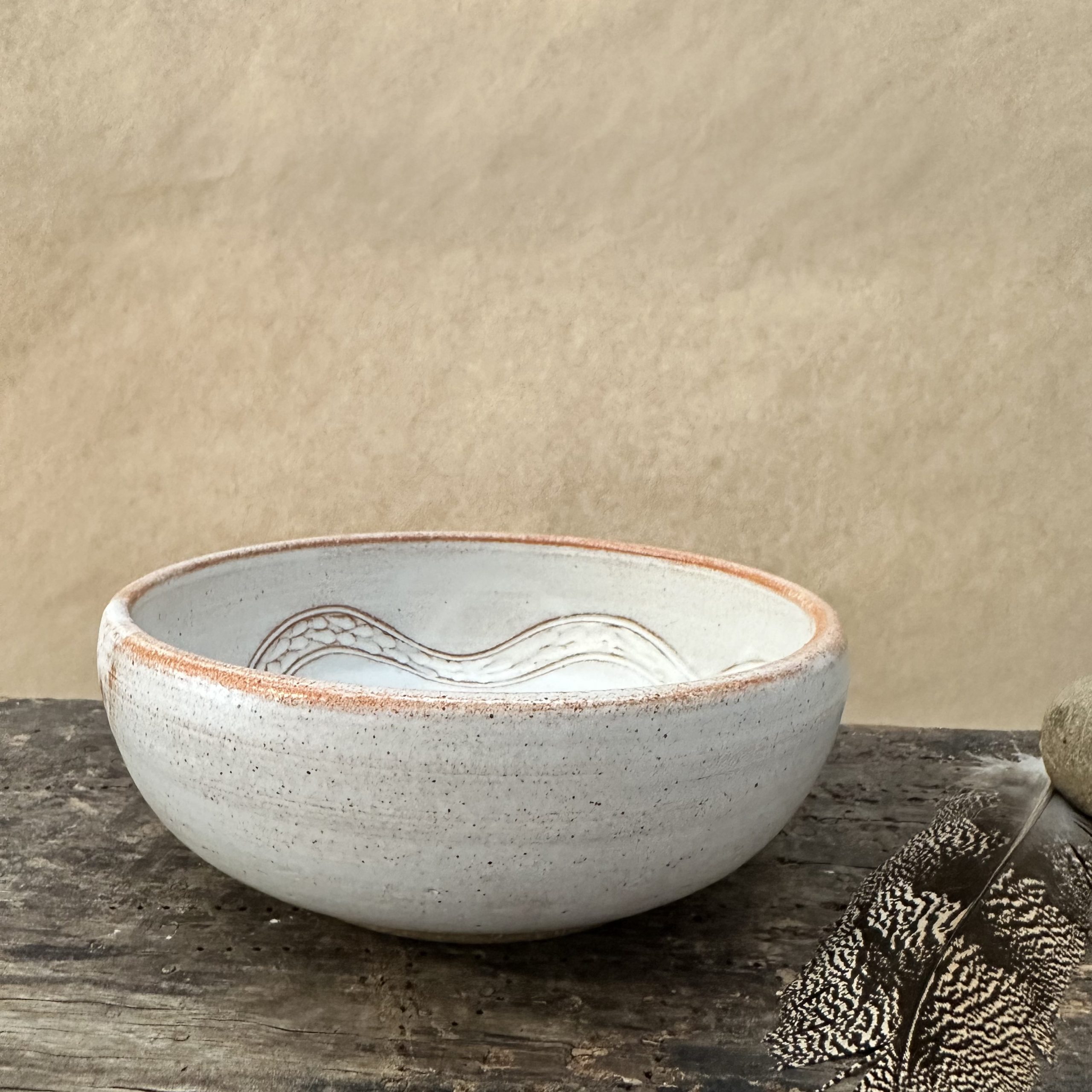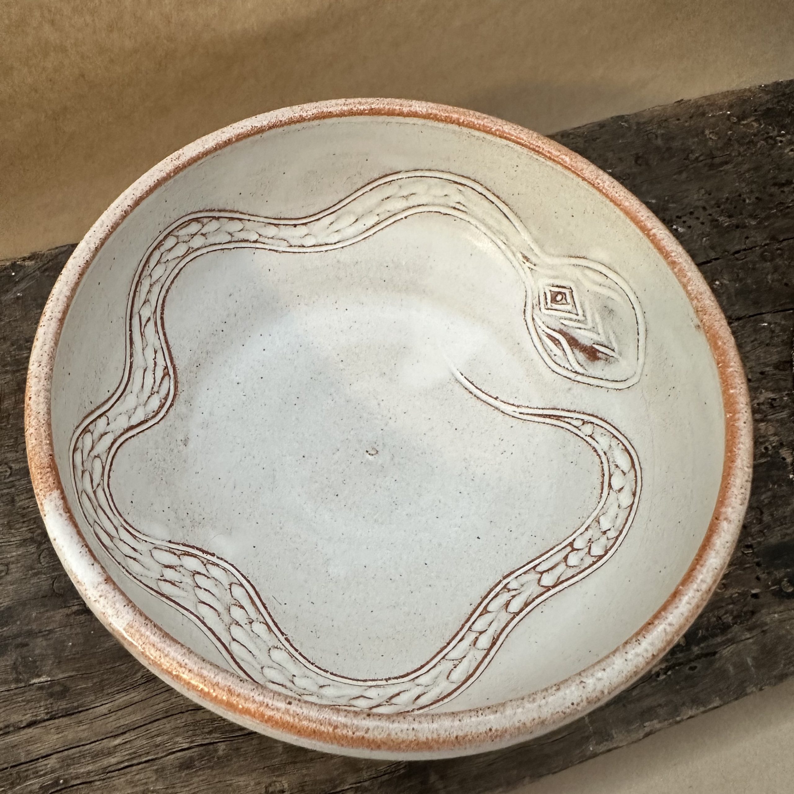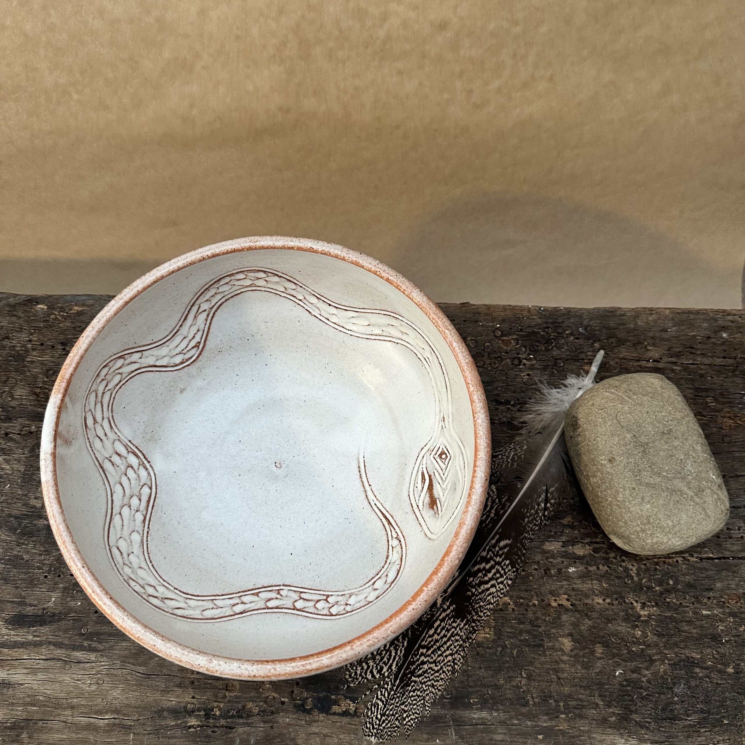 Small bowl carved with a snake and tribal pattern, glazed in Sandstone glaze.