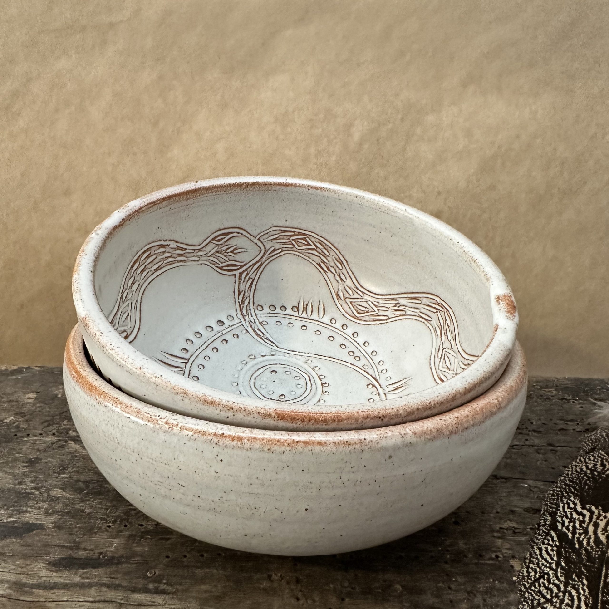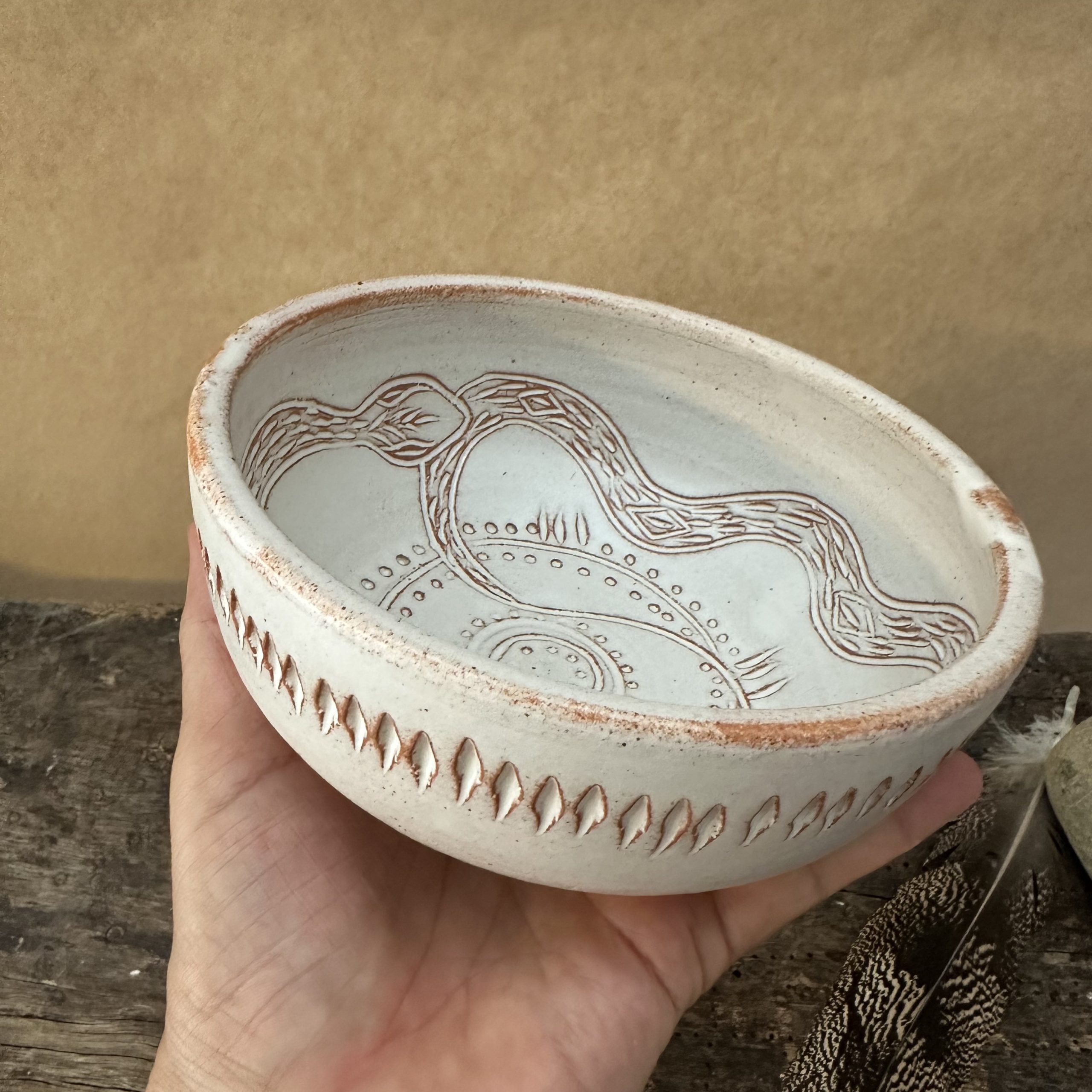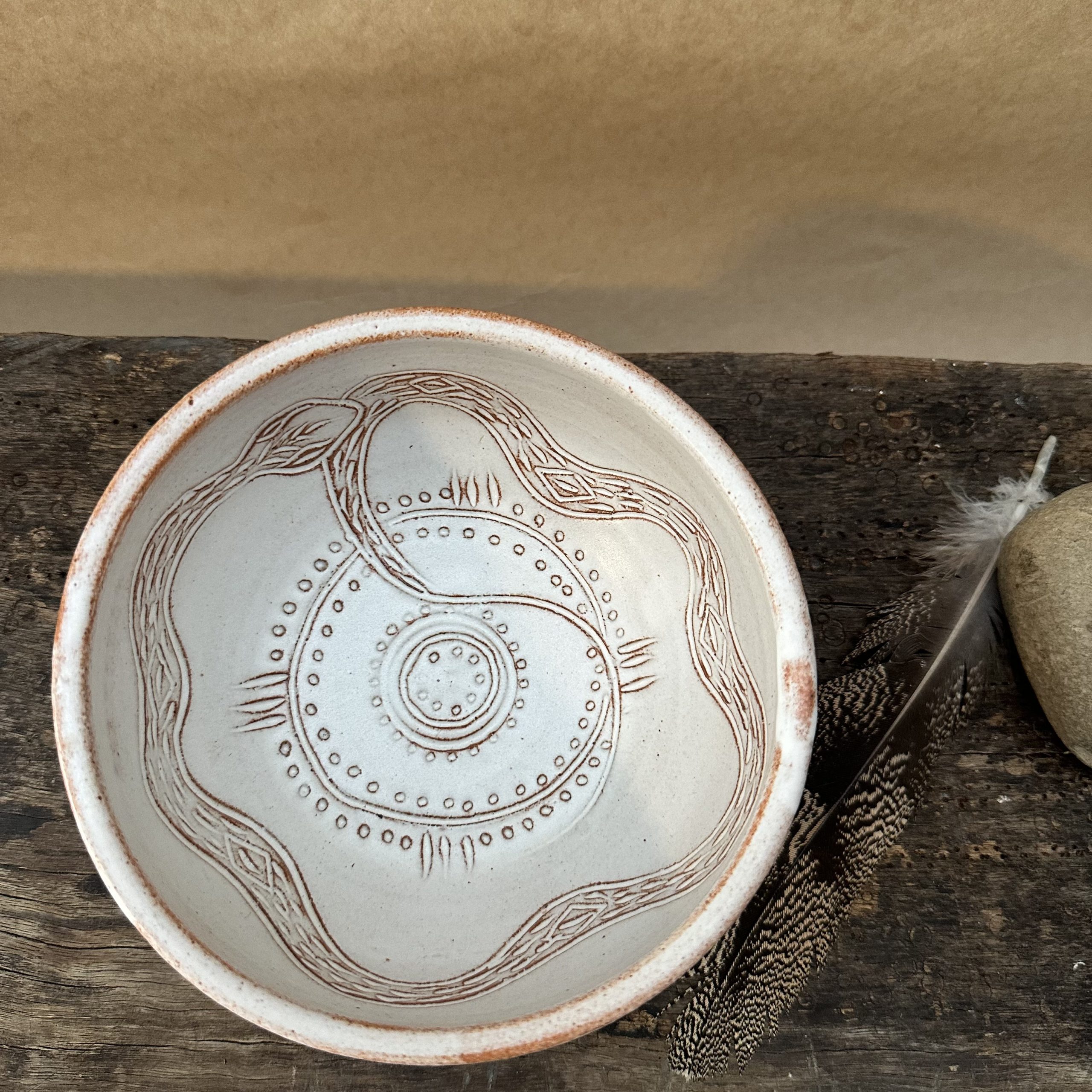 Small bowl carved with a snake and tribal pattern, glazed in Sandstone glaze.