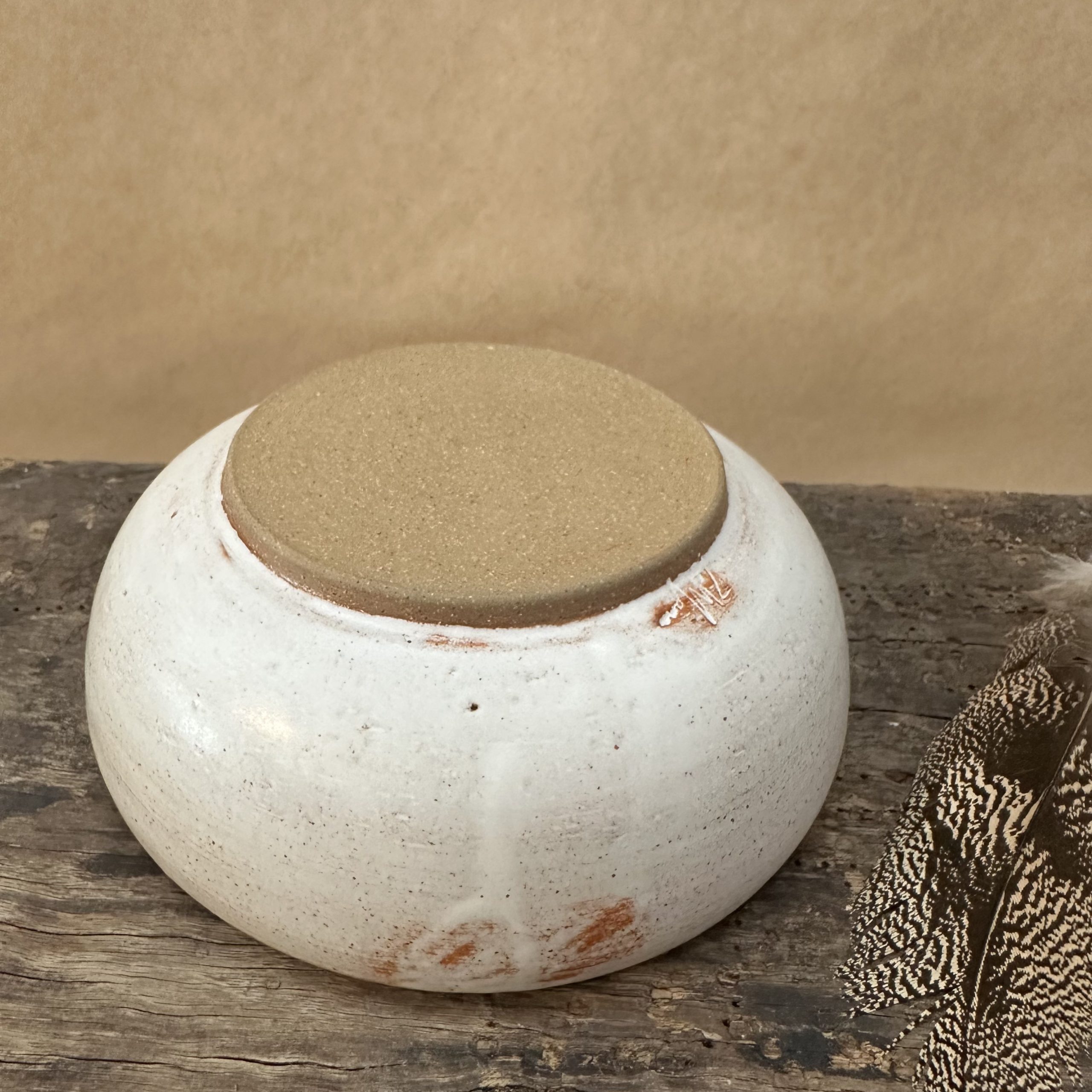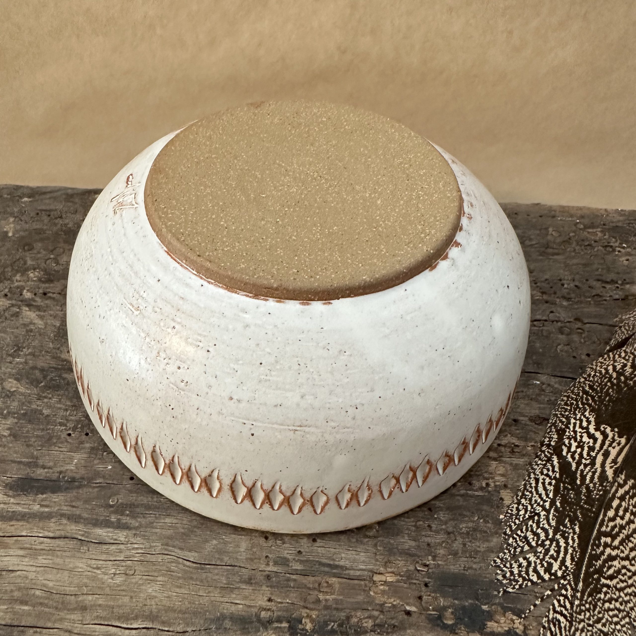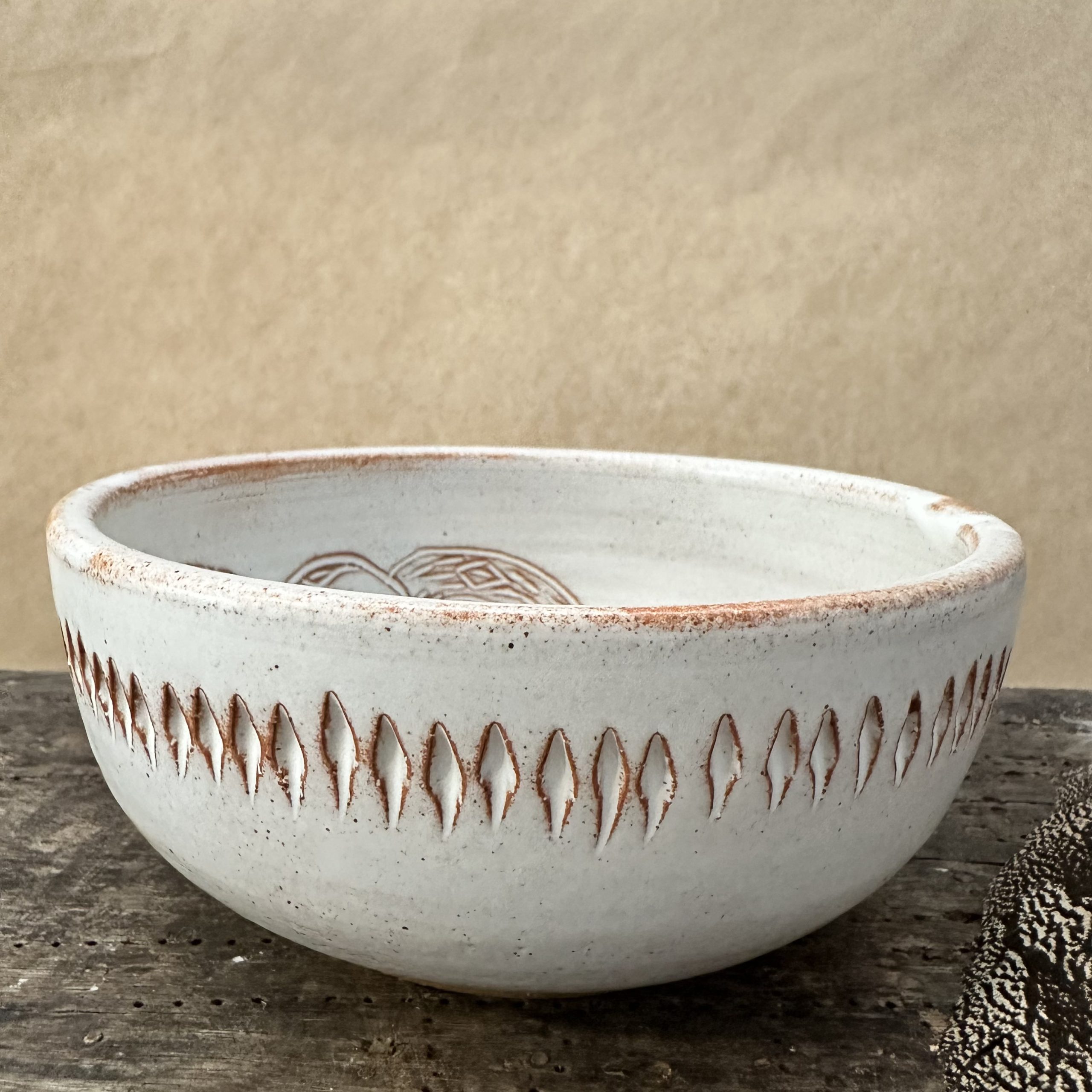 Small bowl carved with a snake and tribal pattern, glazed in Sandstone glaze.