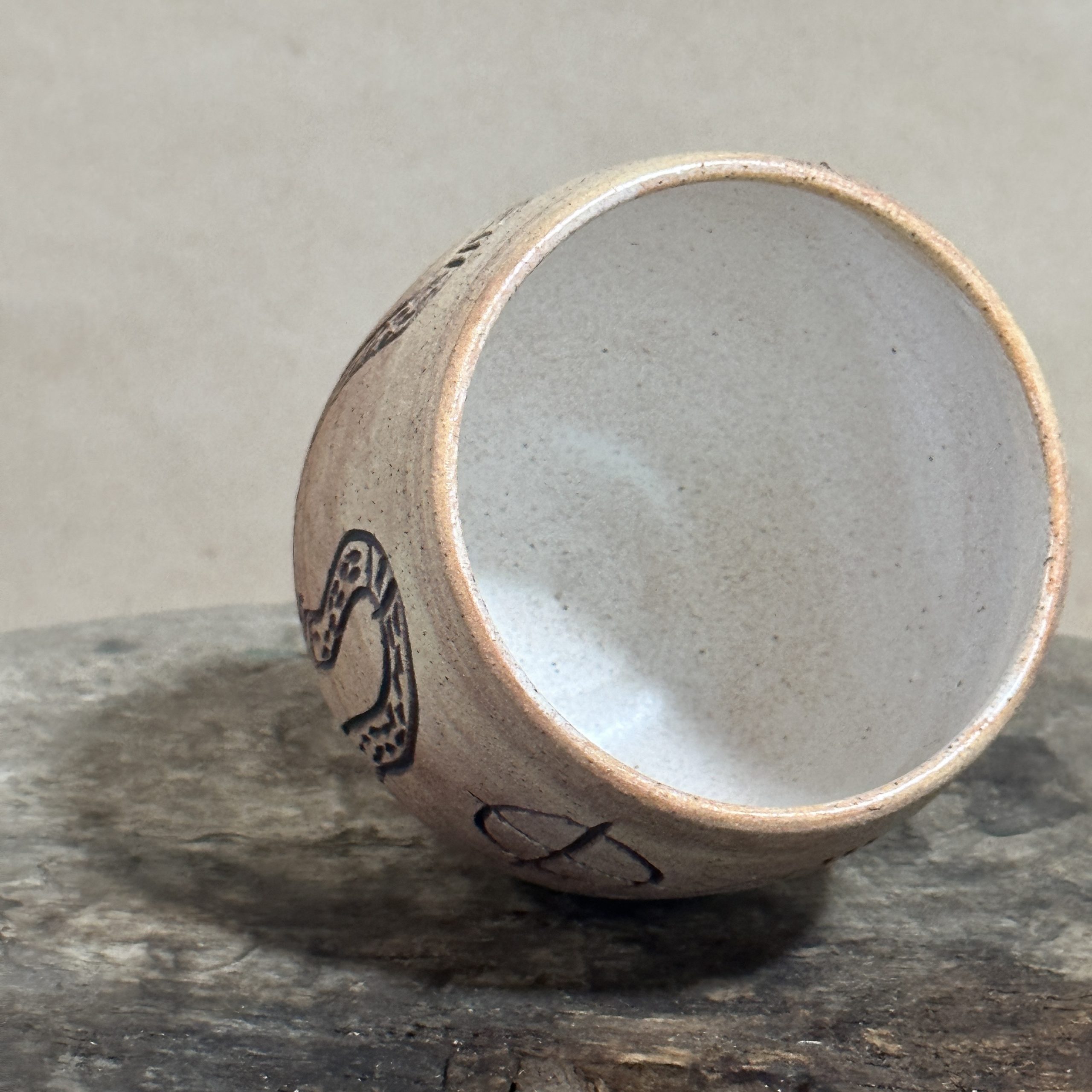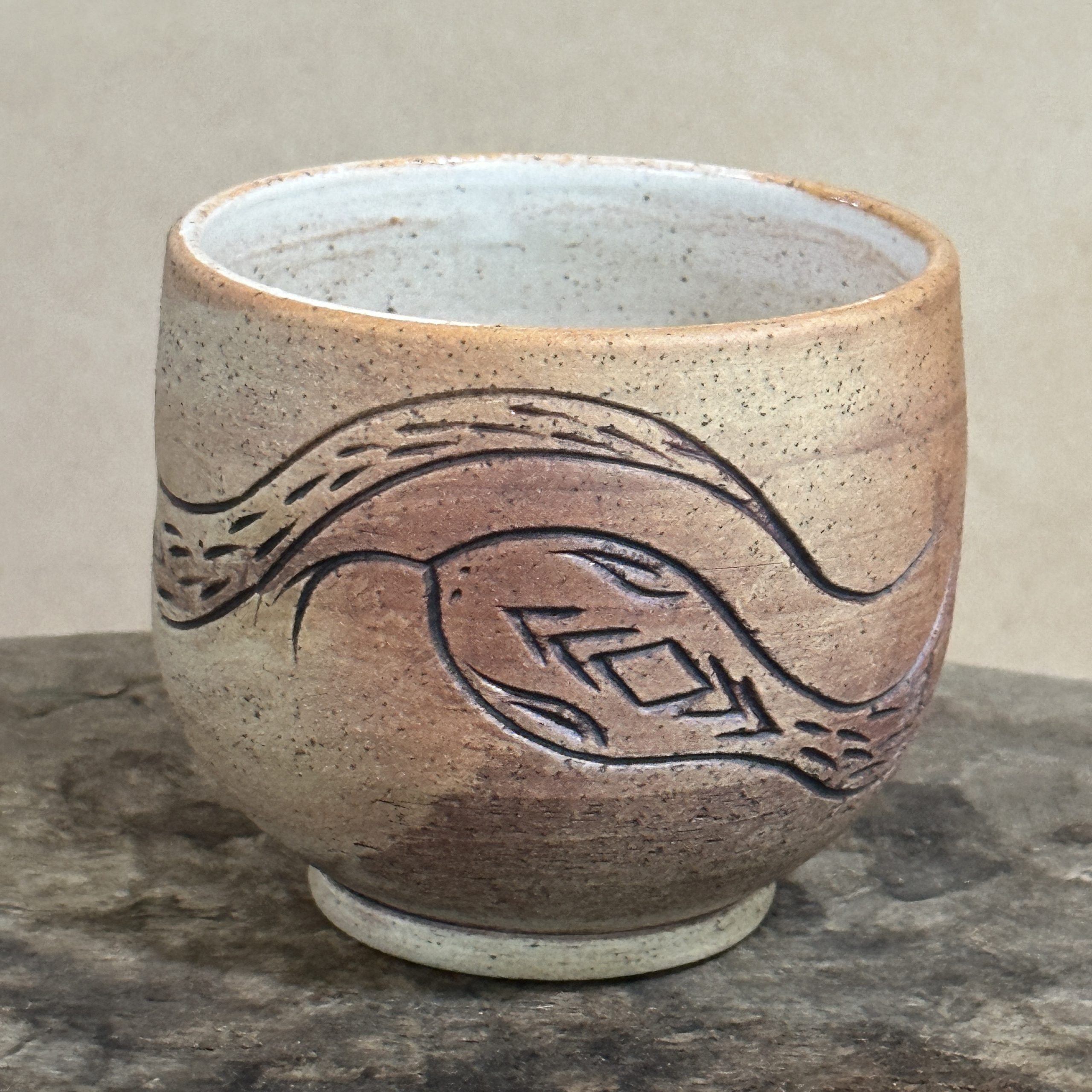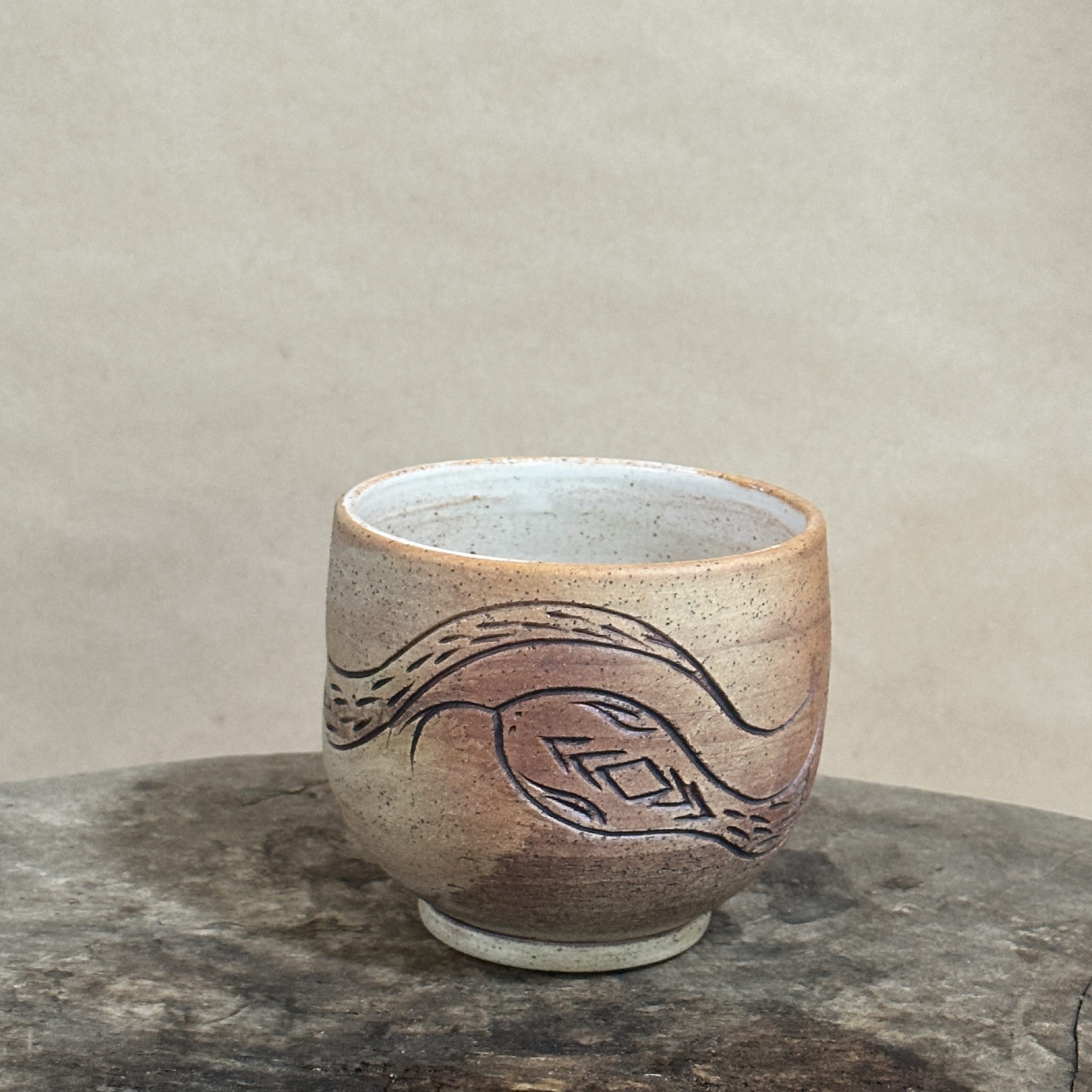 A medium size cuddle cup with epic snake carving. The inside of this cup is glazed in Sandstone (white) and the outside is raw clay (earthy to the touch but still feel good). The base has a beautiful carved symbol and has been sanded smooth so your surfaces will not get scratched.