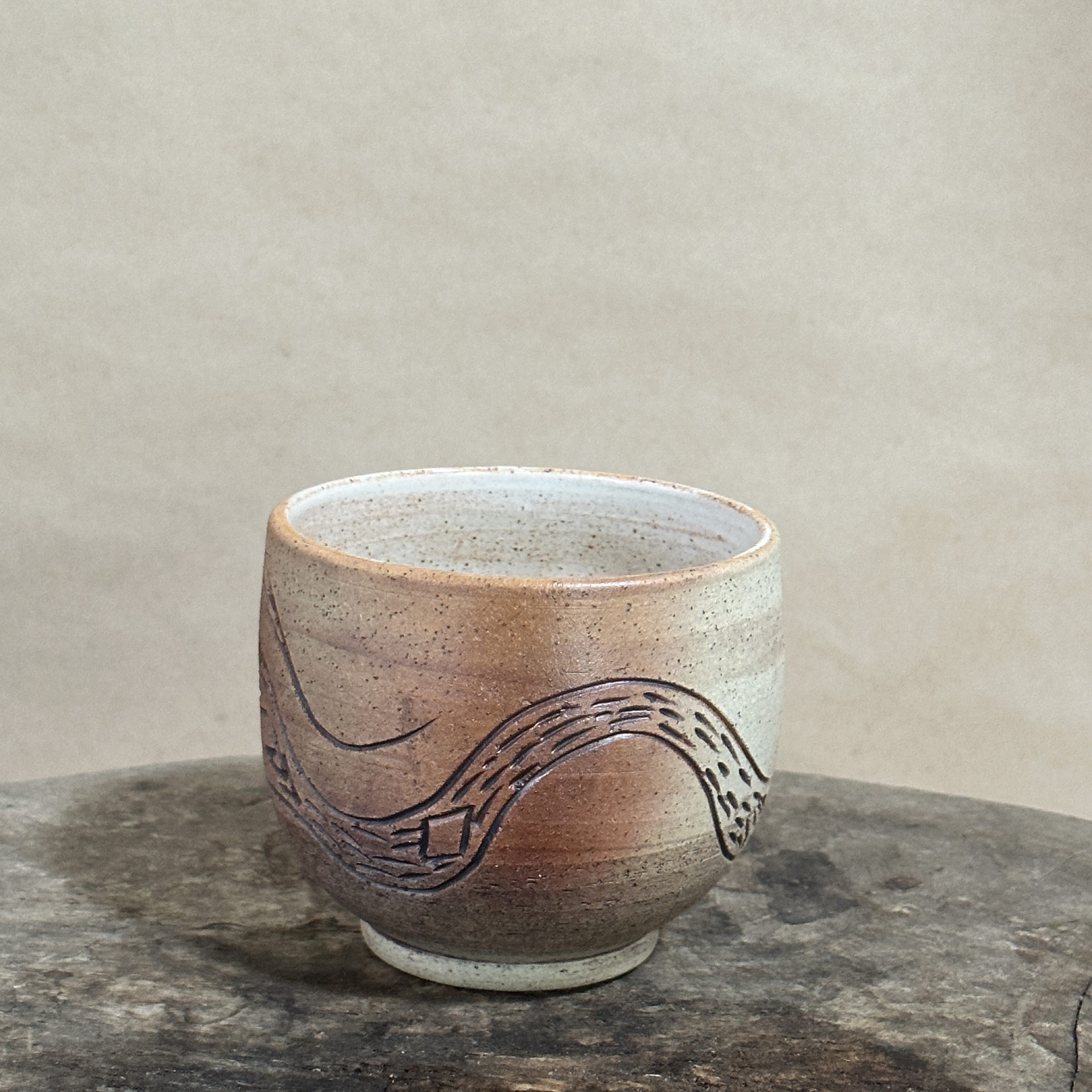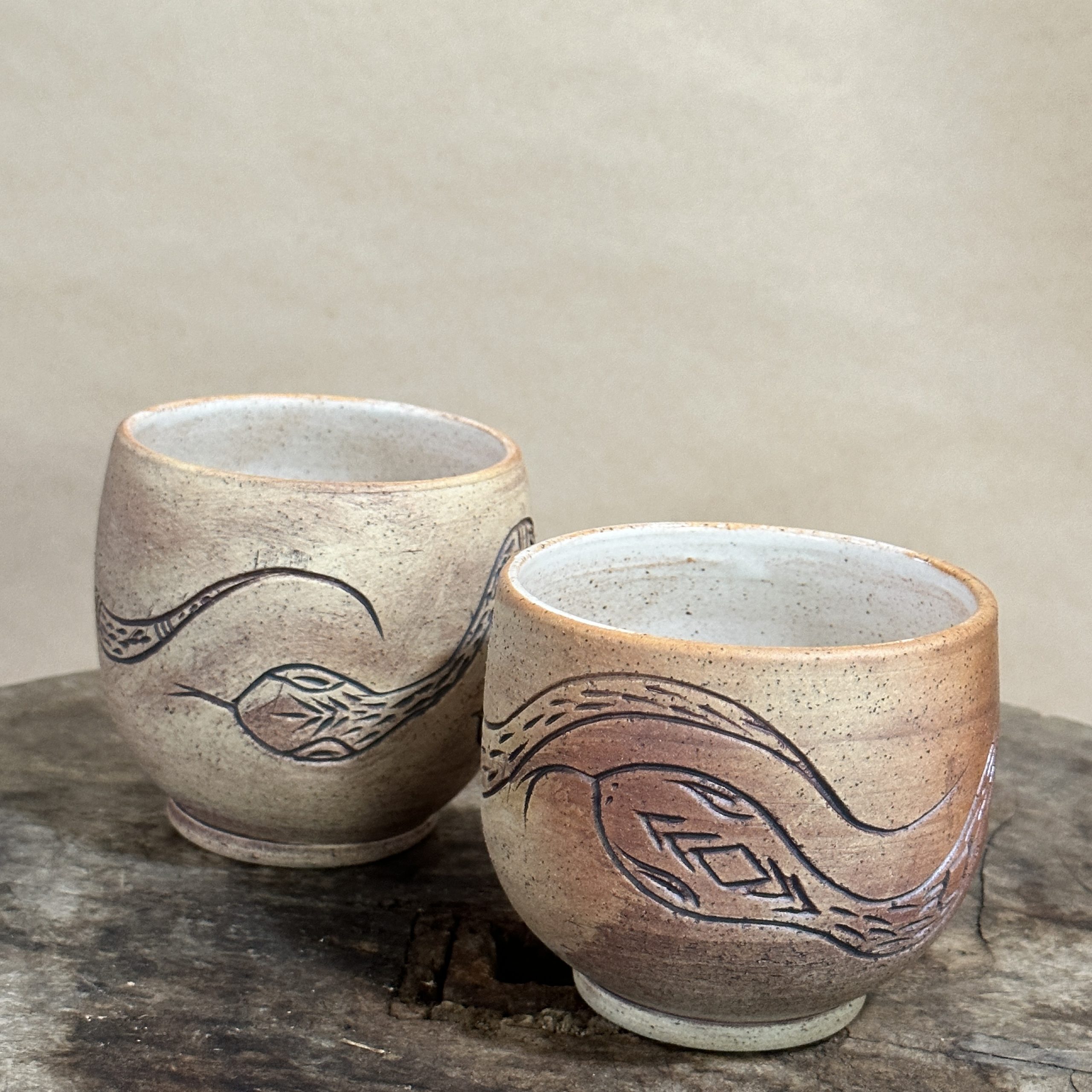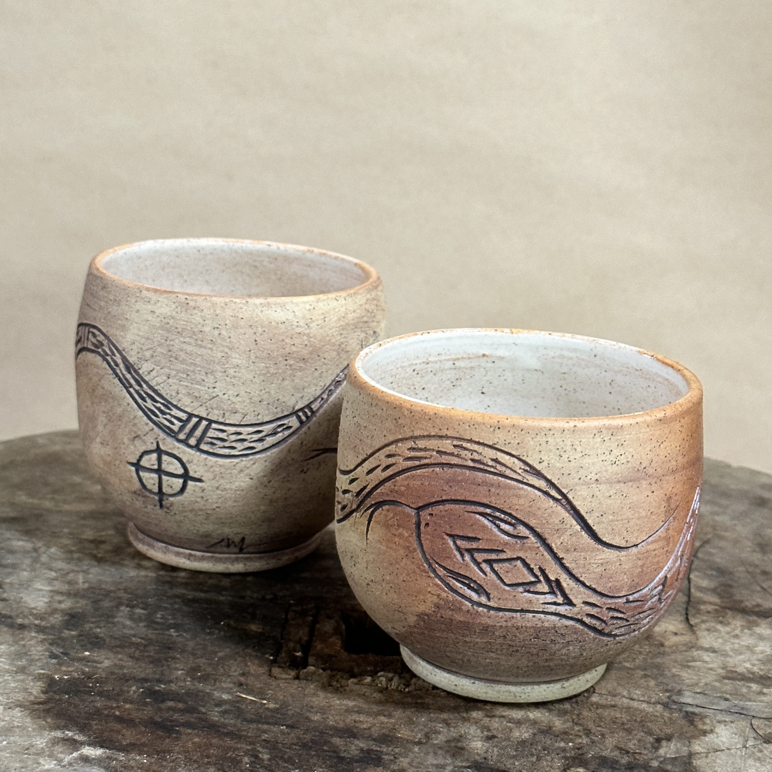 A medium size cuddle cup with epic snake carving. The inside of this cup is glazed in Sandstone (white) and the outside is raw clay (earthy to the touch but still feel good). The base has a beautiful carved symbol and has been sanded smooth so your surfaces will not get scratched.