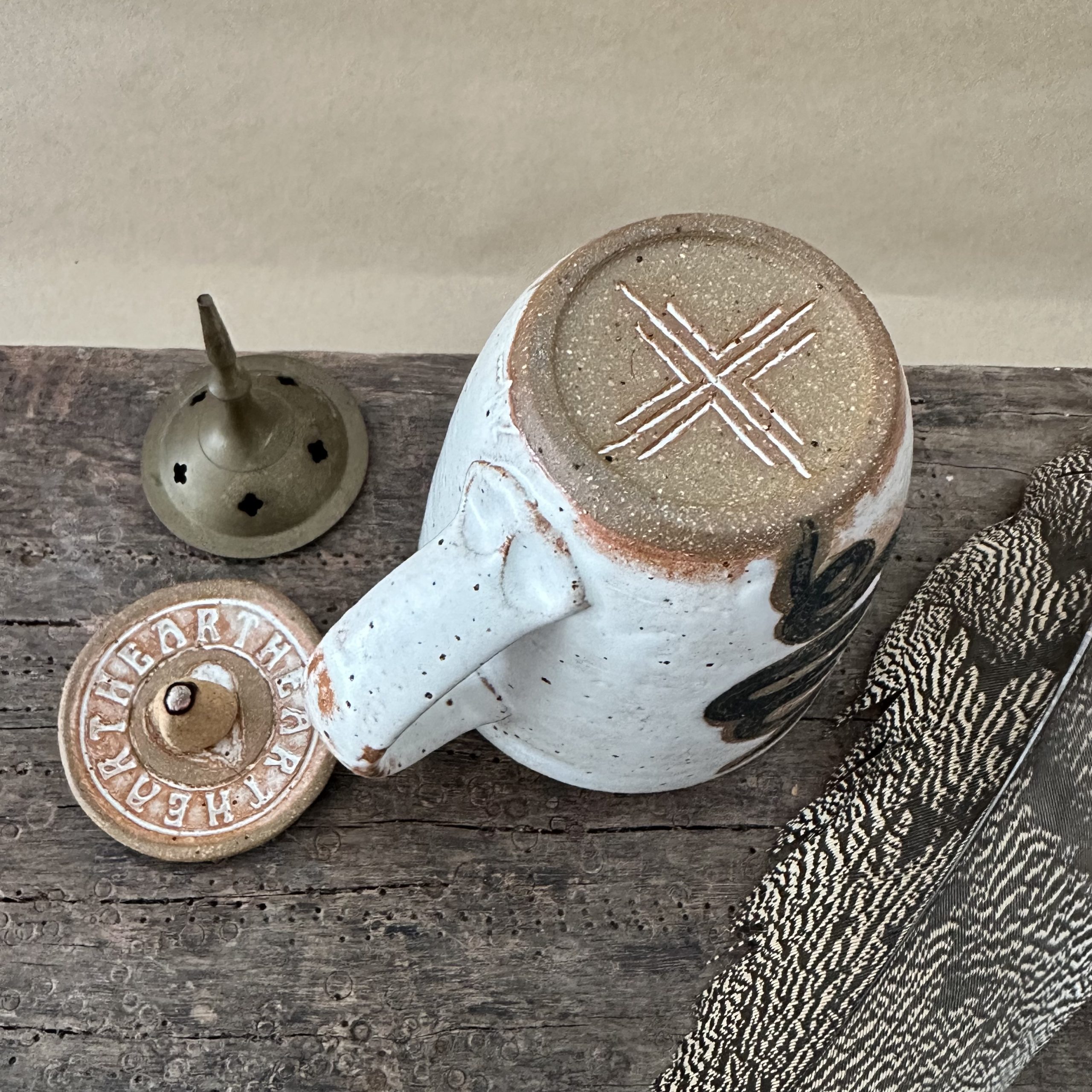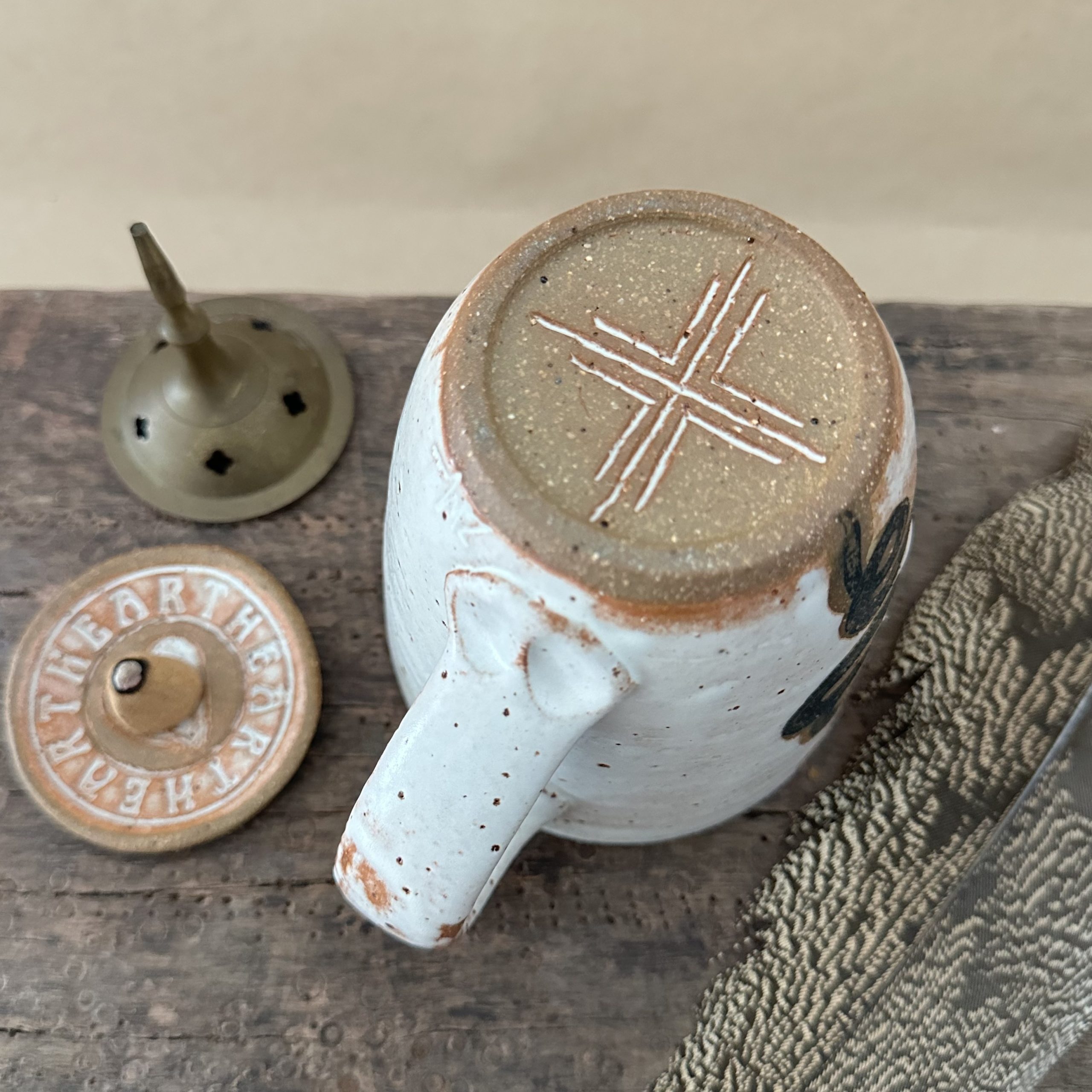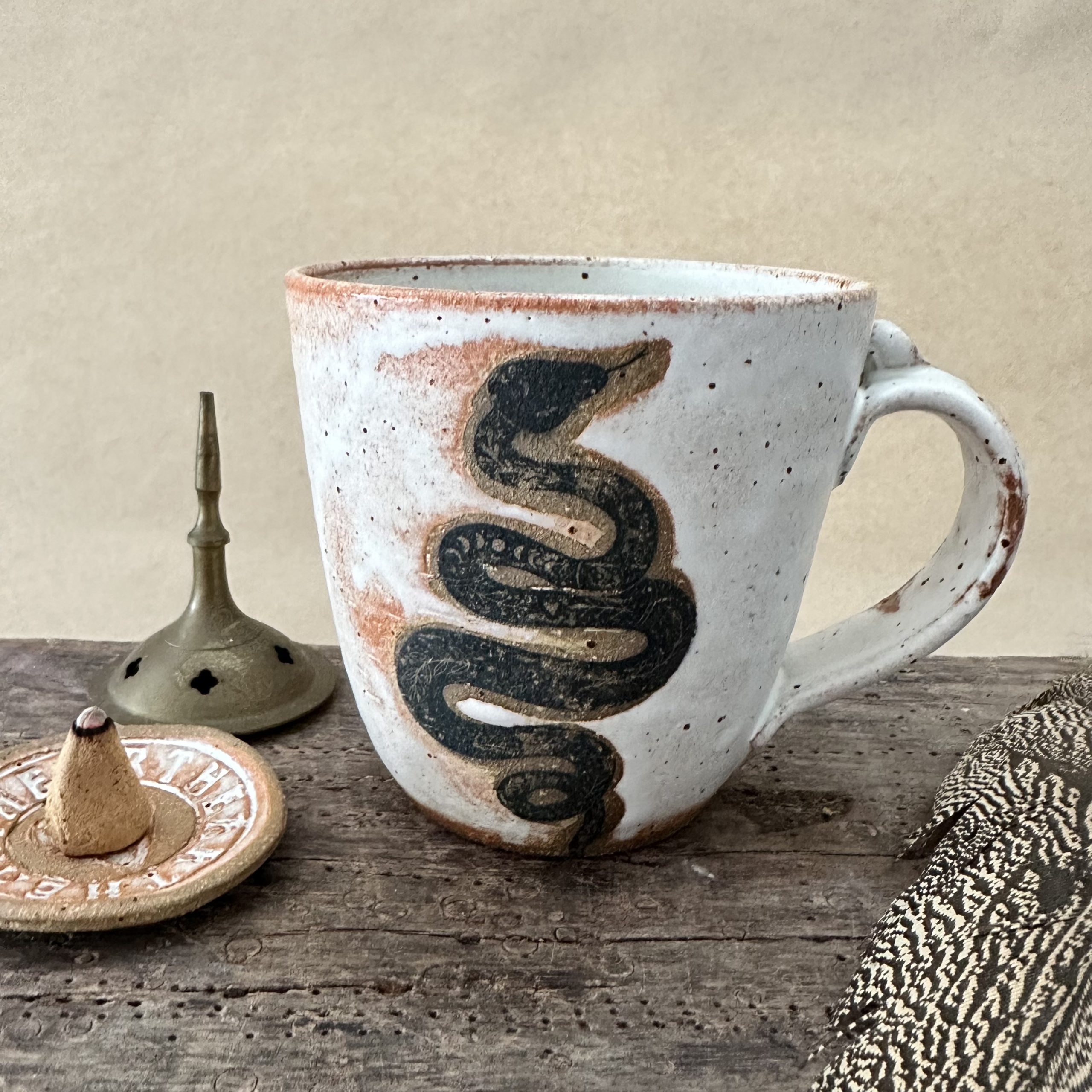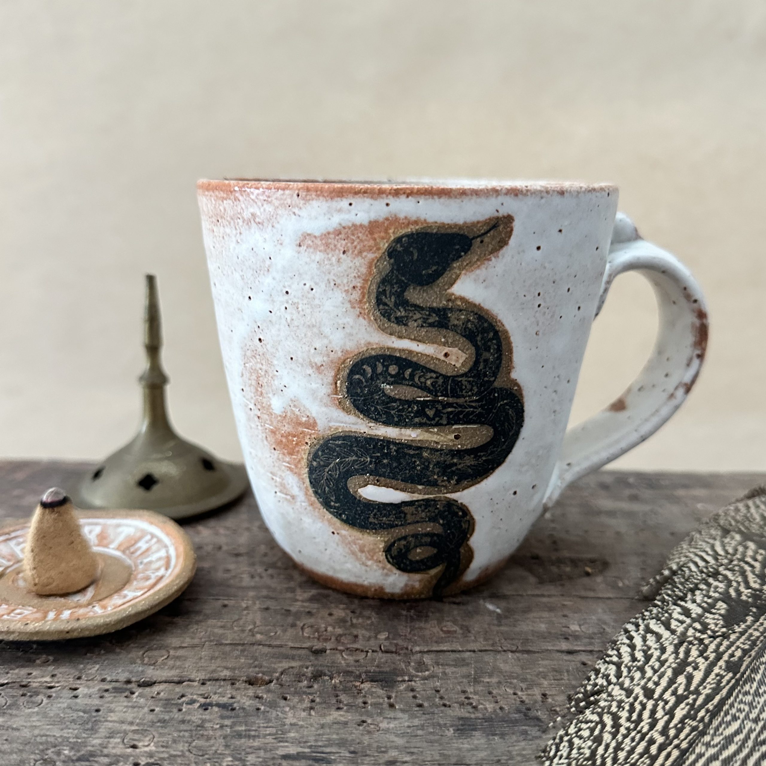A large size mug that features a snake decal, then glazed in Sandstone to enhance the beautiful clay body. The base has been beautifully carved.