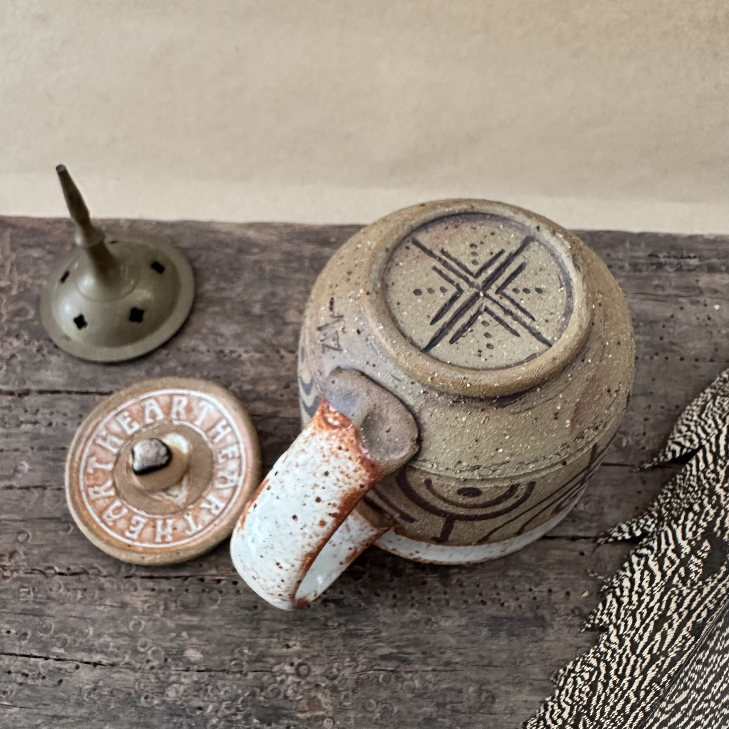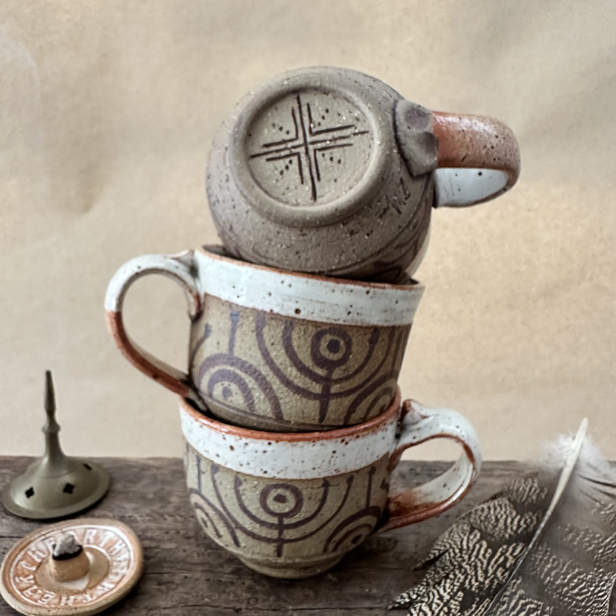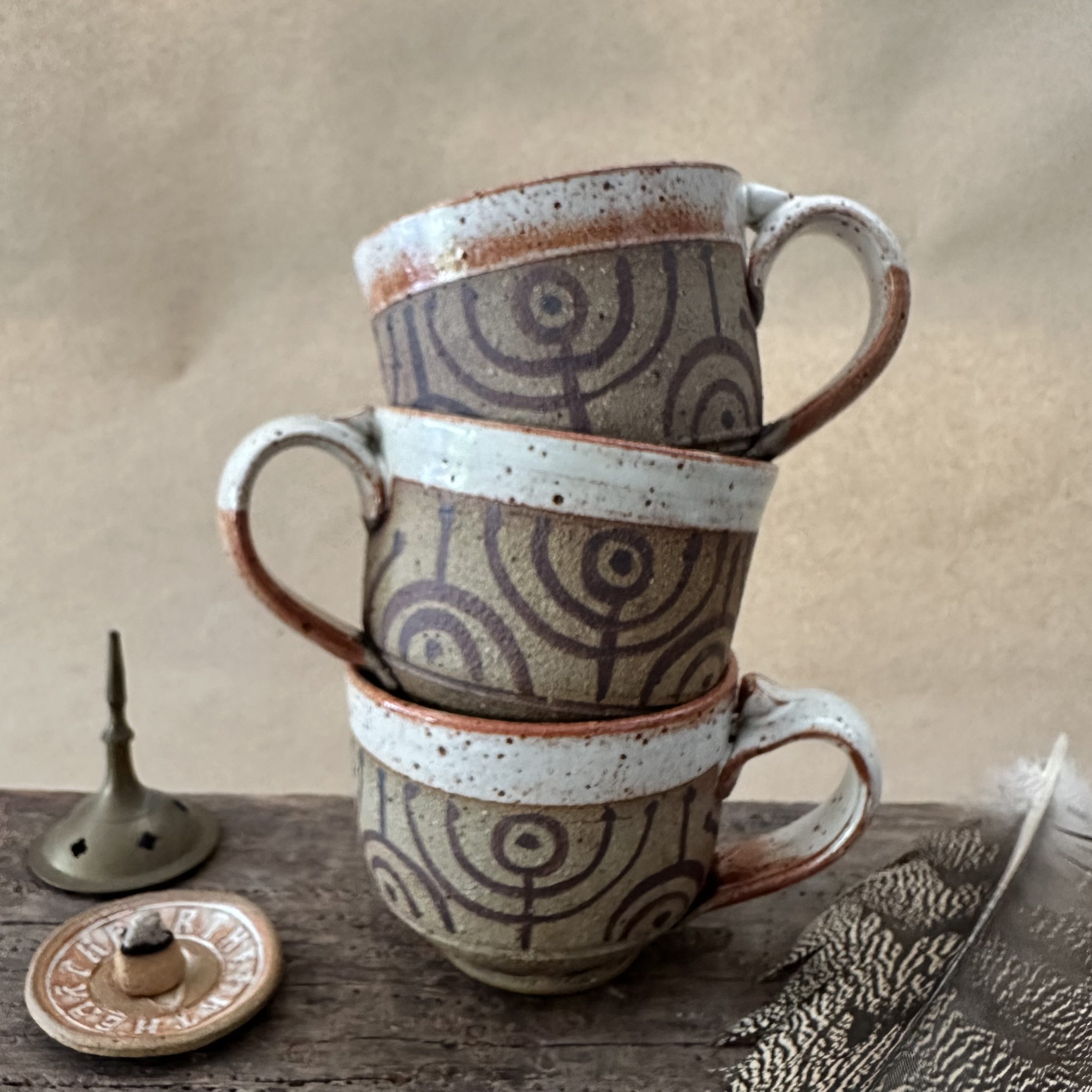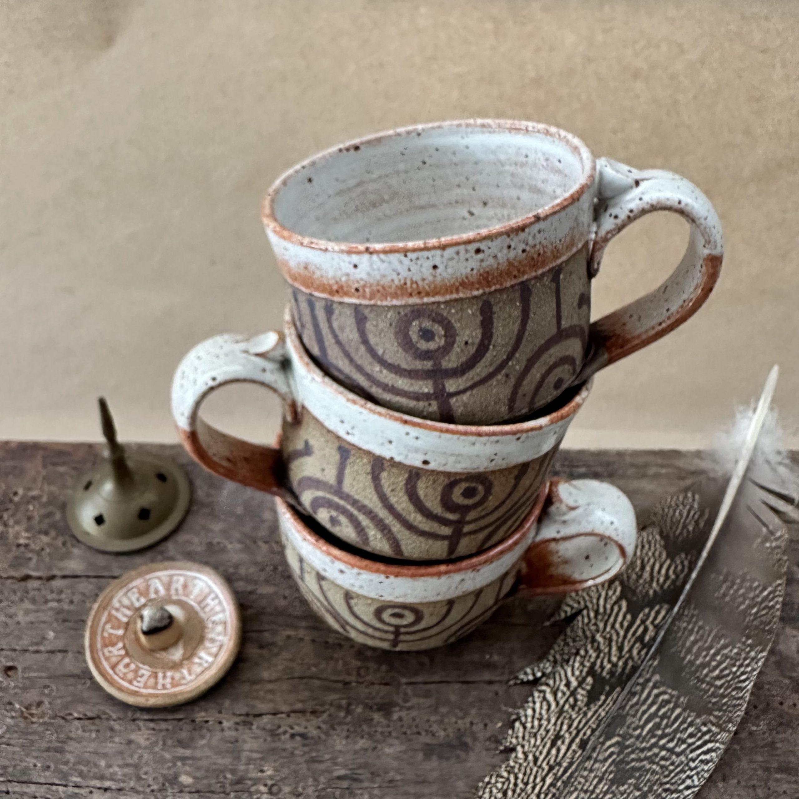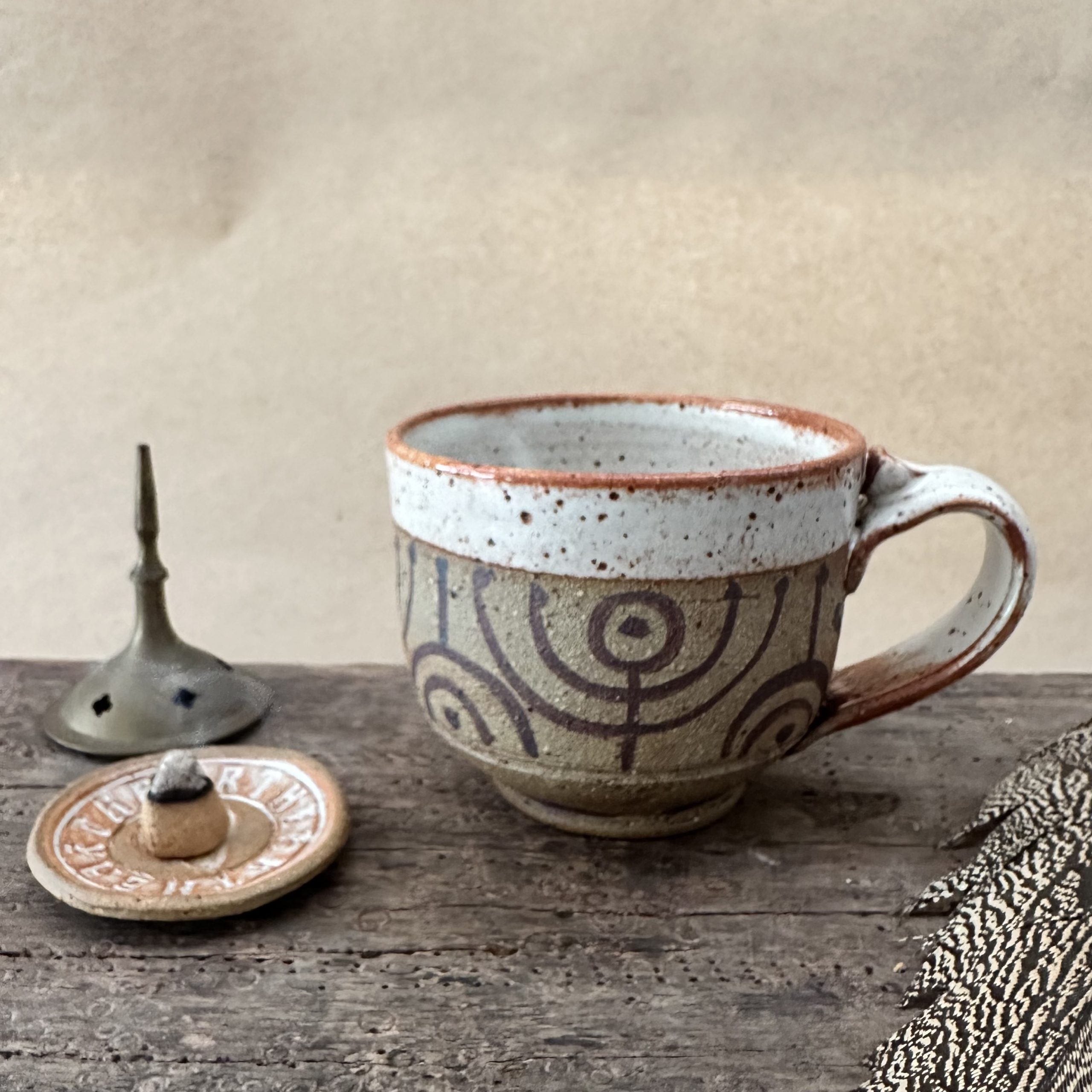 A stunning pottery mug featuring hand painted patterns on raw clay. Glazed inside and over the lip in Sandstone white.
